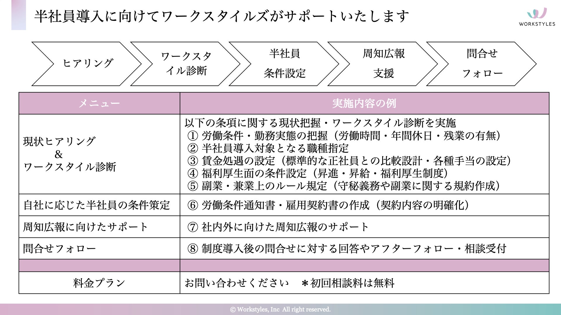 働き方と生き方の選択肢を増やすため、組織コンサルティングを手掛けるワークスタイルズ株式会社(本社:大阪市北区、代表取締役:徳田 直也)は週3日勤務制の雇用形態【半社員®️】の導入支援サービスを開始したことを発表いたします。