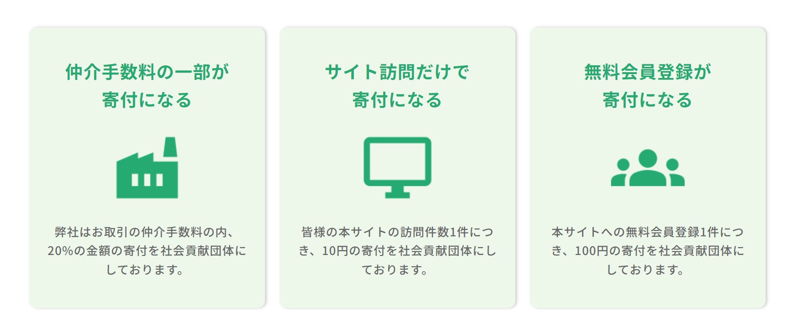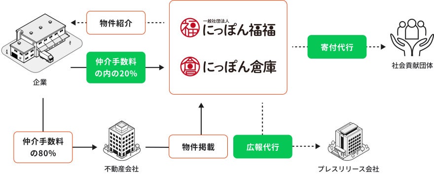 契約時に不動産会社へ支払う仲介手数料の内の20%が社会貢献団体へ寄付されます。更にお支払いされた企業名で広報が同時に行われ、半自動的に企業のCSRを高められることが可能です。