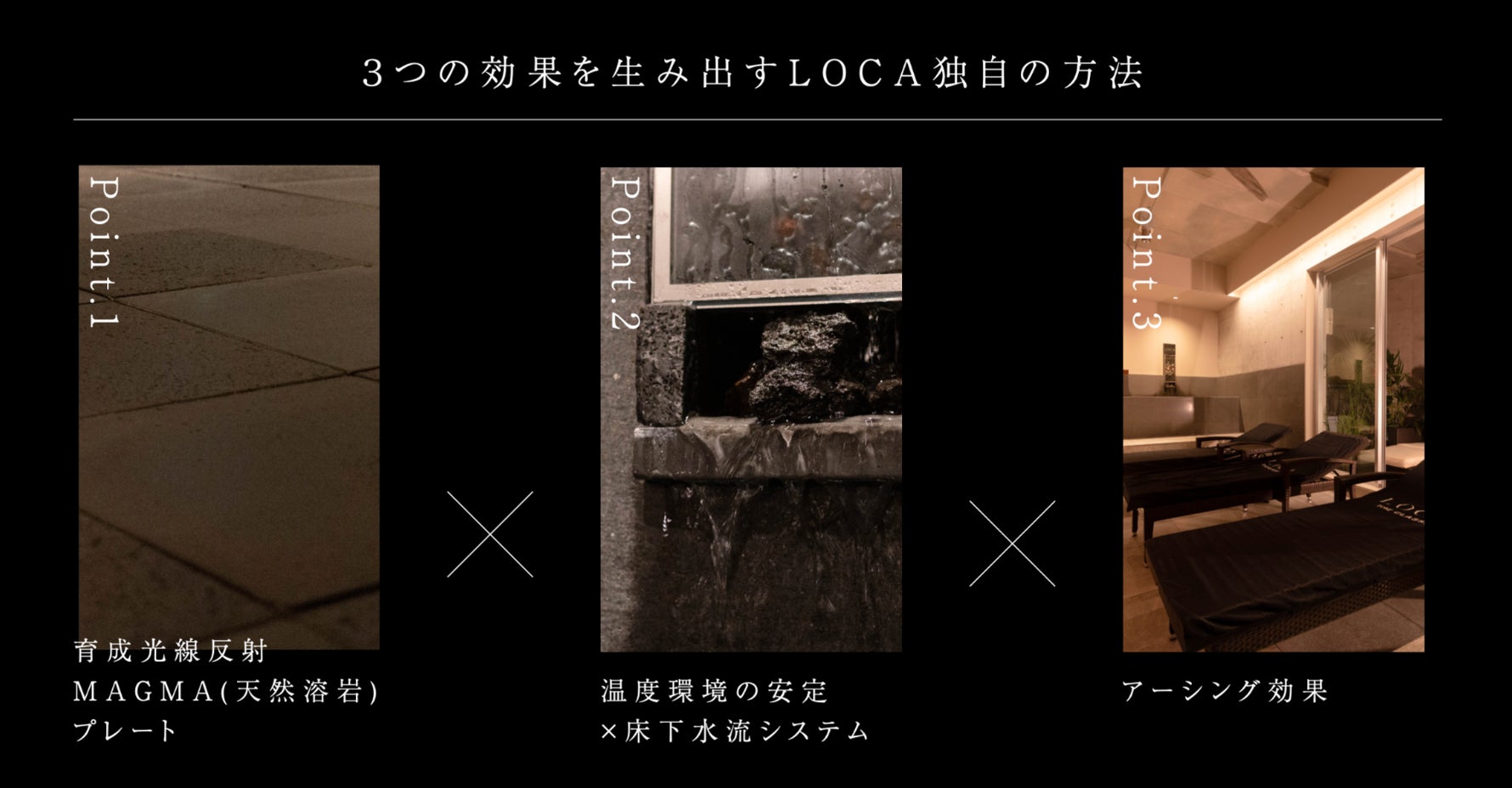 提案するのは、「富士山溶岩浴」「マグマストーン×ロウリュ」を組み合わせた、“室温×湿度×育成光線”の⻩⾦⽐による3 次元ヒーティングシステム。“体温+1℃”となるような室温と絶妙な湿度バランスを実現!この独自の黄金比が唯一無二の体感を⽣み出すことに成功しました。