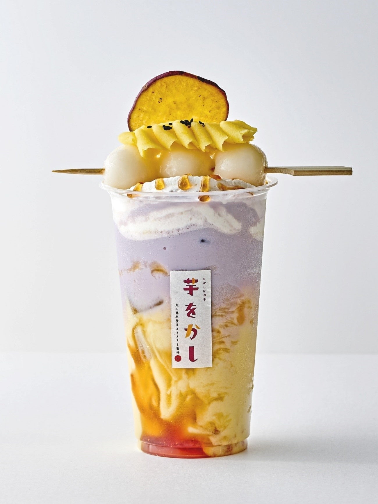 「黄芋」と「紫芋」の2層がまるで夕日のように綺麗(をかし)で、芋と豆乳を合わせたまろやかな口当たり。ホイップクリームやみたらしソースとの相性も抜群です。