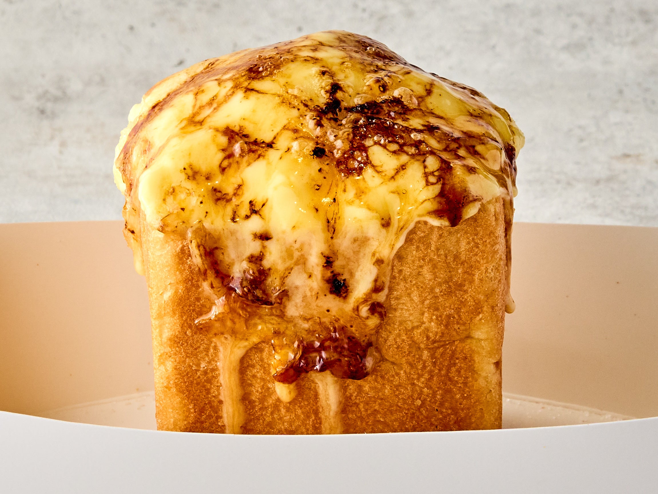 シズル感のあるフォルムが印象的な背徳系のブリュレトーストは、ふんわりとしたブリオッシュ生地の中に、茨城県産の紅はるか・素材本来の甘味を引き出した国産お芋のアイスクリーム・ホイップクリームをふんだんに詰め込み、トップには優しい甘さのプリンをのせてこんがりとブリュレしました。