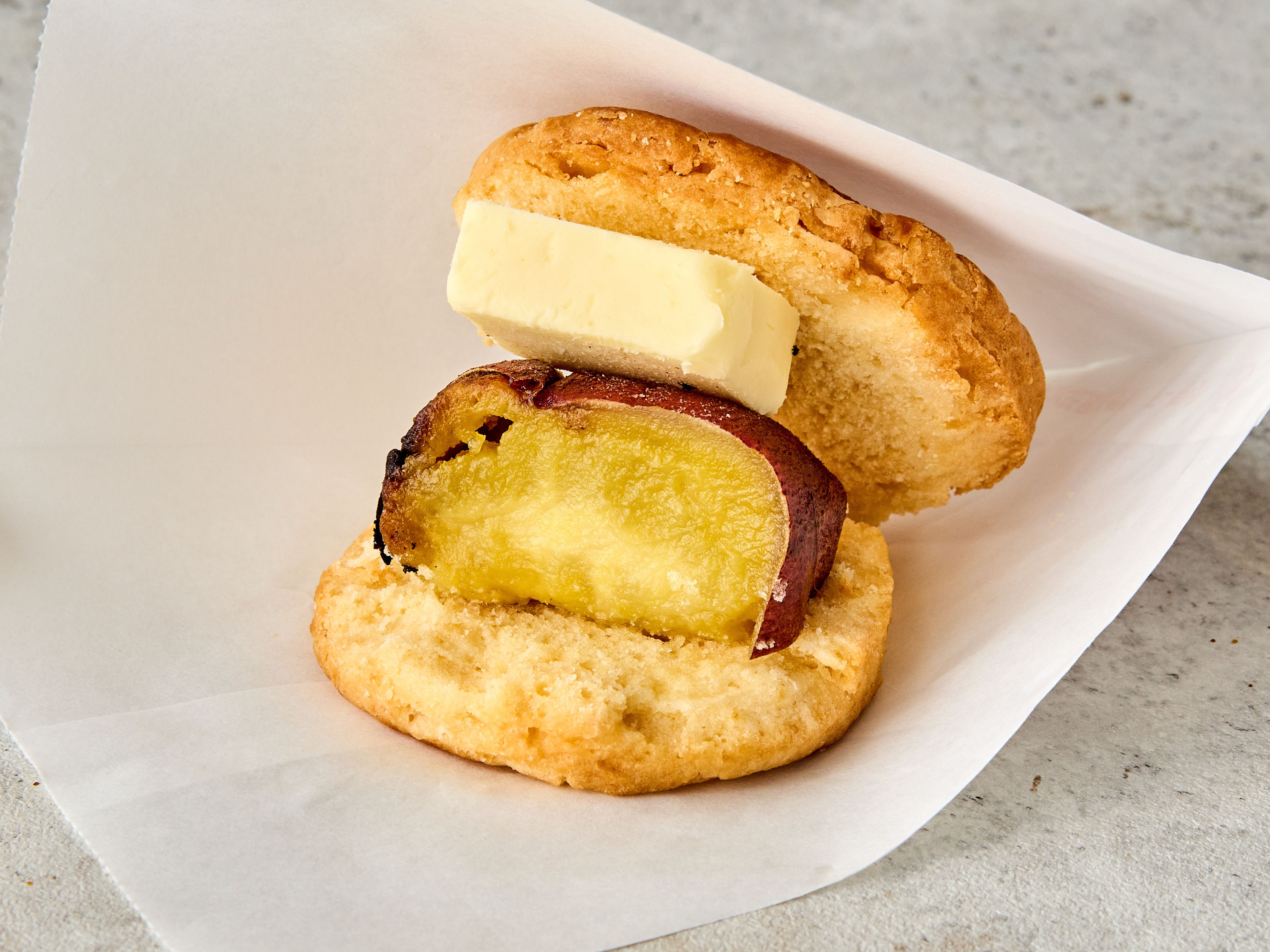風味はもちろん、食感も楽しむことができる「背徳!お芋とバターのスコーンサンド」は、こんがりとトーストしたさっくり食感のスコーンに、アツアツの茨城県産紅はるかとバターを挟んでいます。じゅわっと溶け出す有塩バターとお芋の甘じょっぱいマッチをお楽しみください!