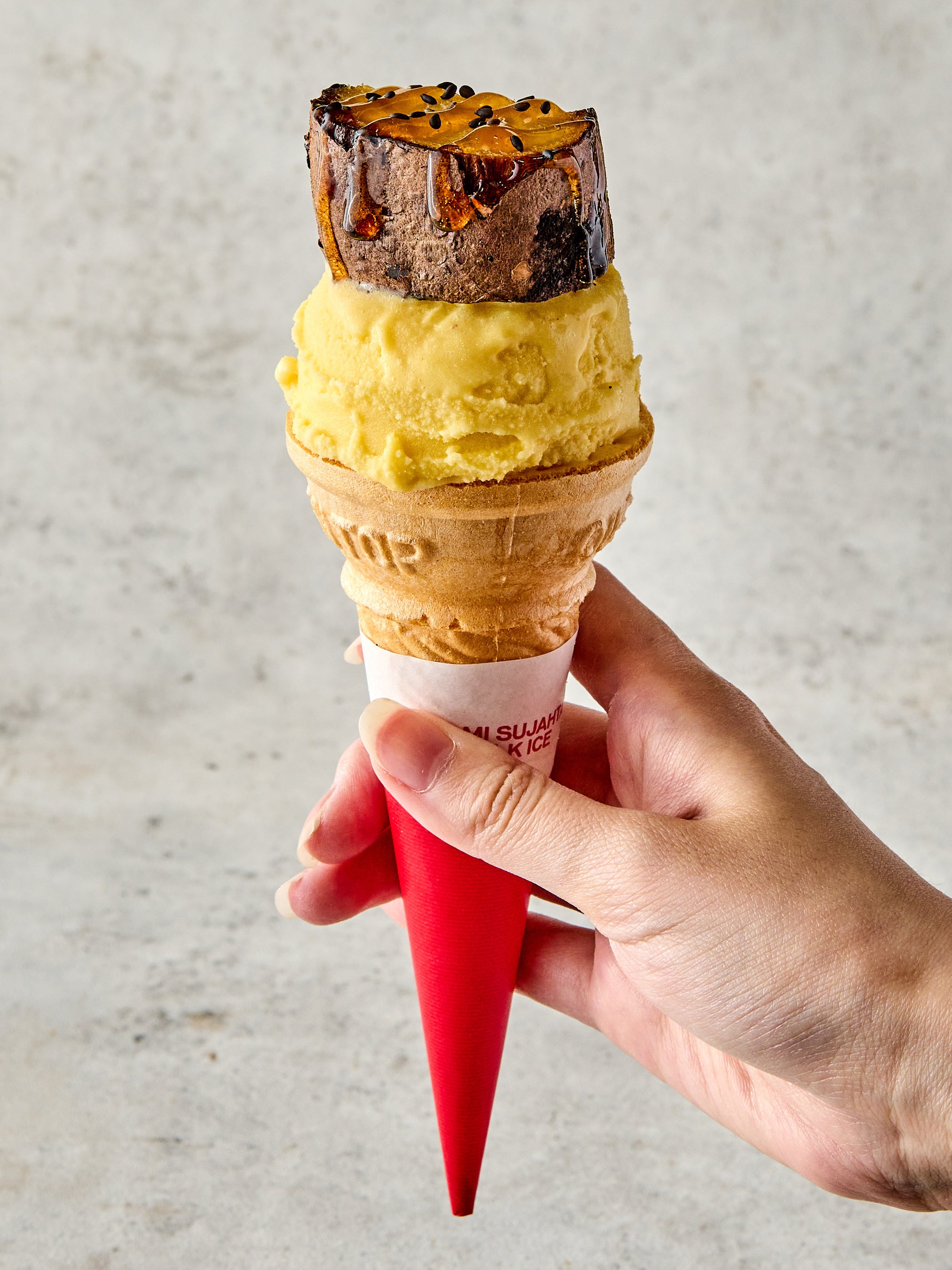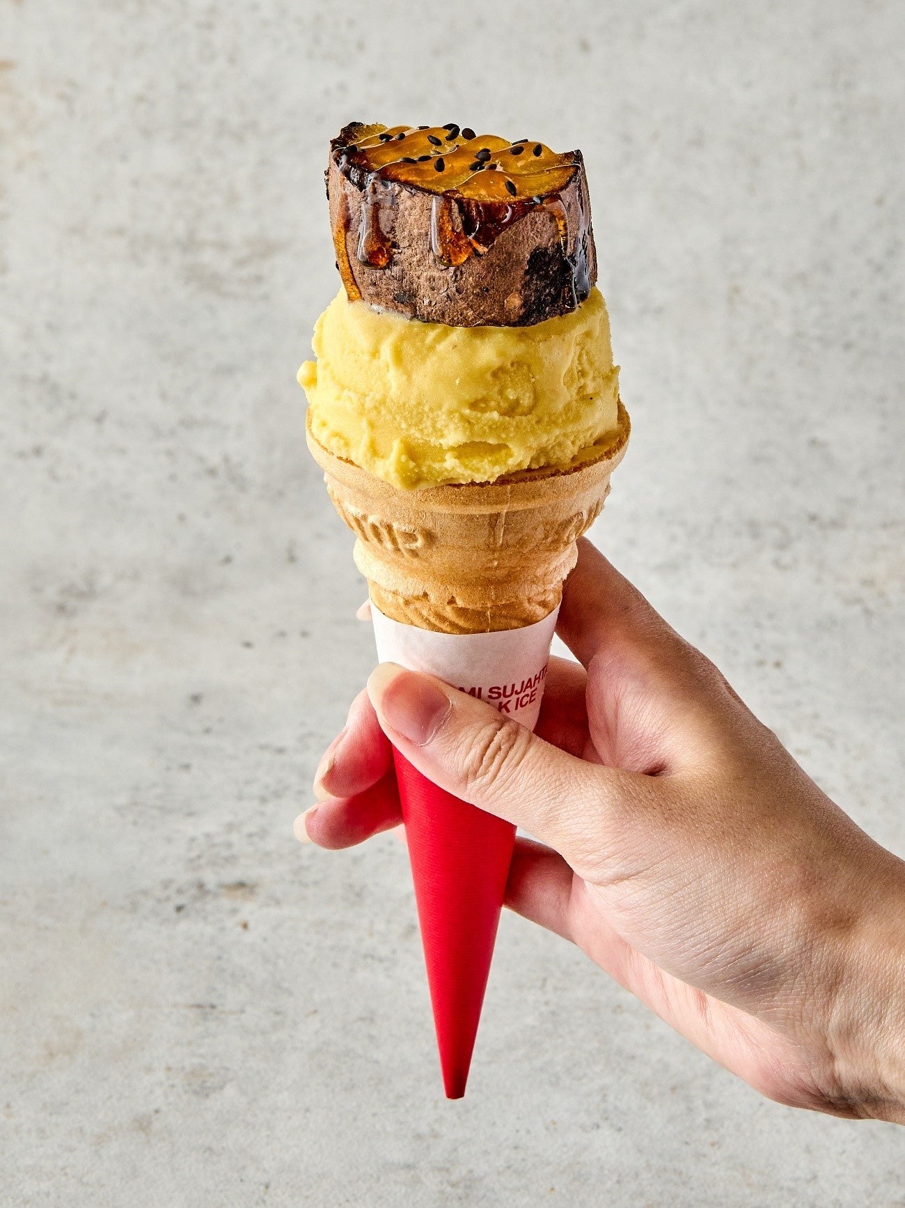 お芋本来の甘さを大切にした国産お芋のアイスクリームに、糖度の高い茨城県産紅はるかとみたらしソースをトッピング。暑い夏の食べ歩きにぴったりの、ひんやりスイートな商品です。