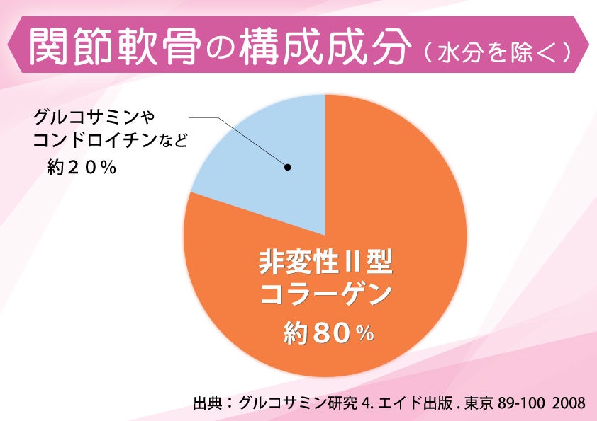 II型コラーゲンは関節の軟骨に多く分布し、軟骨を構成する主要成分です。水分を除いた関節軟骨の構成成分の割合はII型コラーゲンが約80%で、その他20%にグルコサミン、コンドロイチン、ヒアルロン酸等が含まれています。鶏由来の非変性II型コラーゲンはアメリカのハーバード大学で研究が進められ、形を変えることなく抽出することに成功。体内で有用物質として認識されるため、ひざ関節の柔軟性、可動性をサポートすることが報告されています。