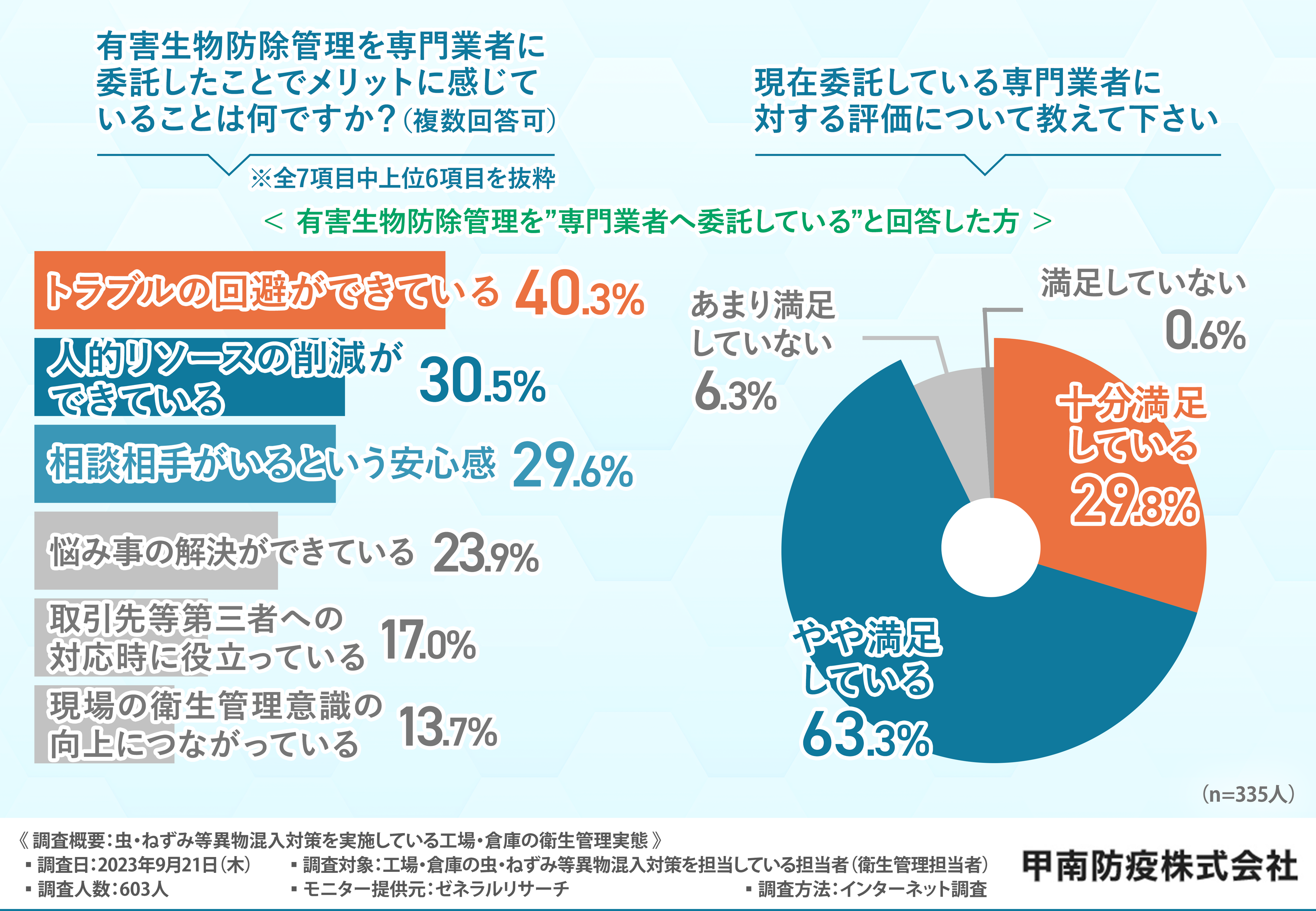 「有害生物防除管理を専門業者に委託したことでメリットに感じていることは何ですか?(複数回答可)」と質問したところ、『トラブルの回避ができている(40.3%)』と回答した方が最も多く、次いで『人的リソースの削減ができている(30.5%)』『相談相手がいるという安心感(29.6%)』と続きました。