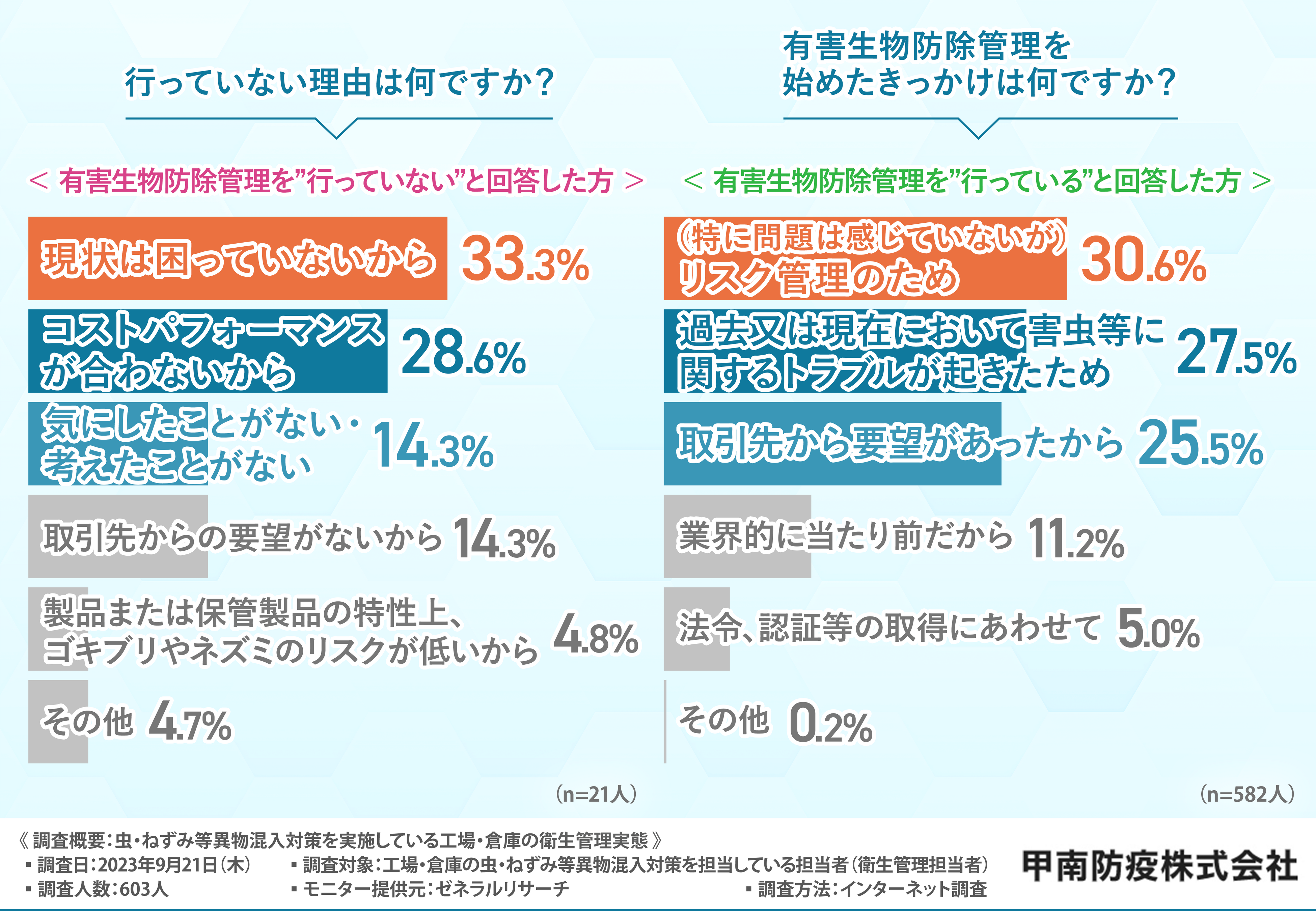 また、過去や現在において害虫等のトラブルがあったことや、取引先からの要望といったことも有害生物防除管理を始めたきっかけとして多いことが分かりました。