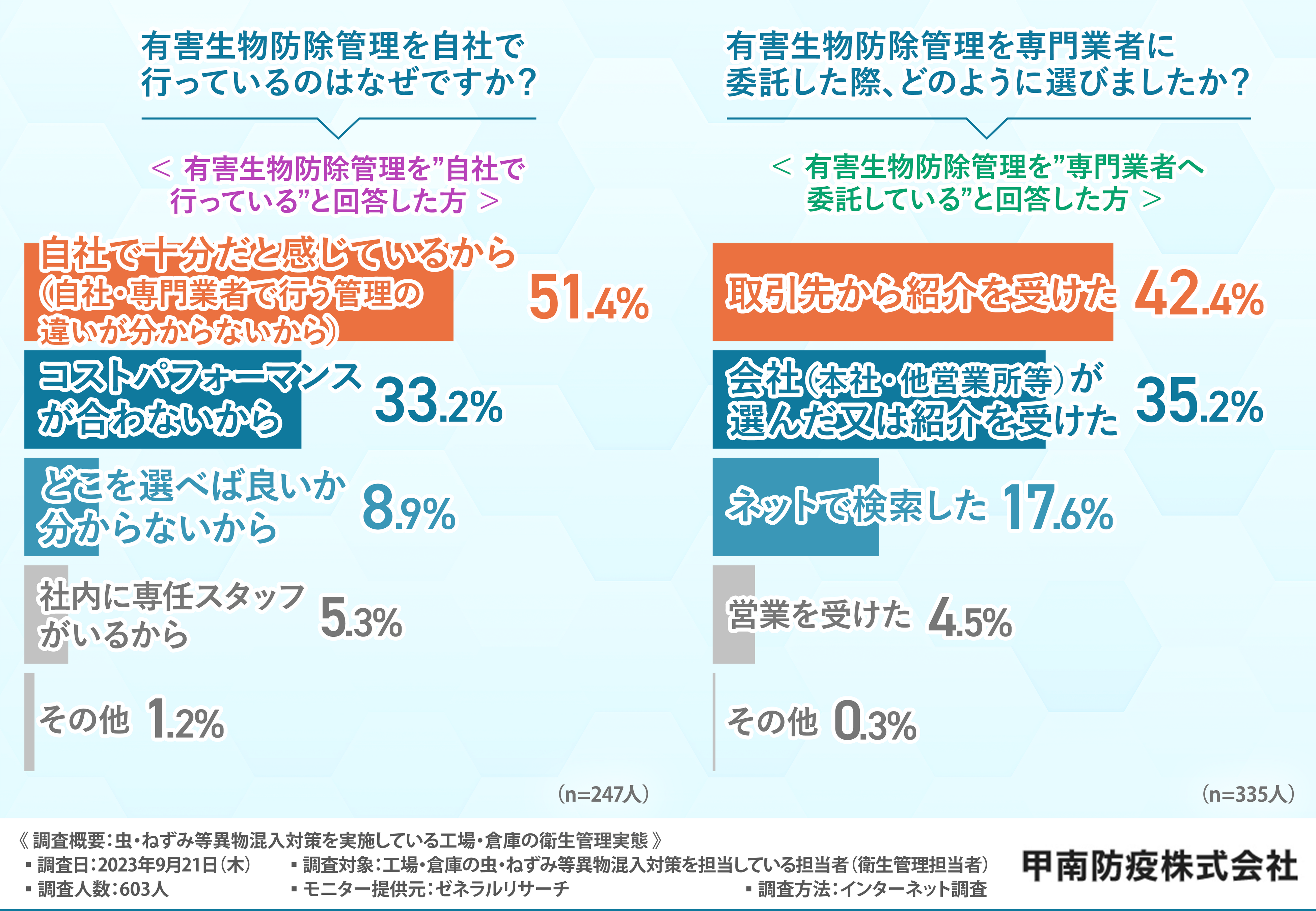 有害生物防除管理を自社で行っている方と業者に委託している方といましたが、それぞれどういった理由があるのでしょうか。