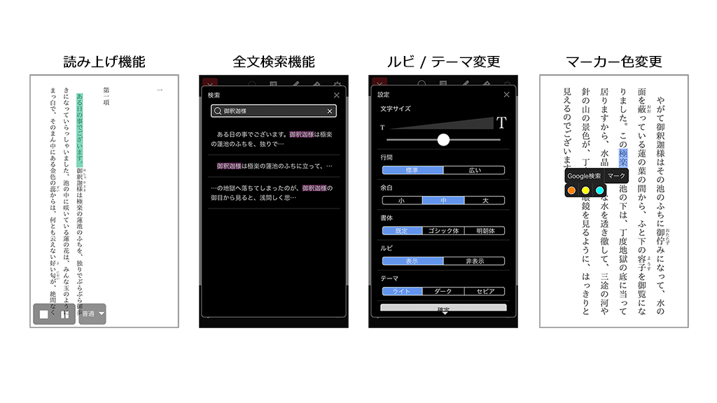 読み上げ機能や全文検索機能の搭載に加え、ルビのオン/オフ、背景色・文字色を変えるテーマ変更、テキストコンテンツの任意の箇所に引いたマーカーの色変更、マーカー箇所へのメモ追加機能も新たに提供いたします。