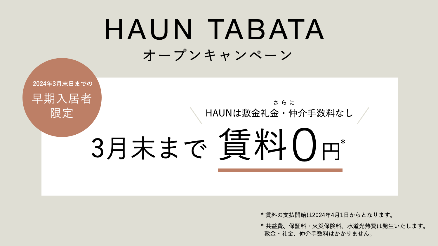 「HAUN TABATA」オープン記念としてお得なキャンペーンをご用意いたします。2024年2月の入居開始時期〜3月末までにご入居いただくお客様に限り、賃料が3月末まで0円となります。早くご入居いただくほどお得に「HAUN」での生活をスタートしていただけます。