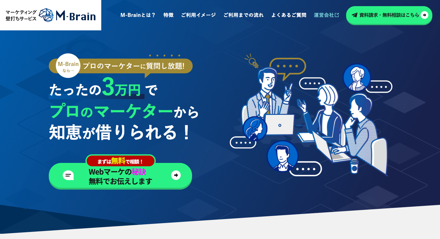 M-Brainは、マーケティング戦略の上流から、Web広告/SEO対策/Web制作/インハウス化などのデジタルマーケティングを中心に、プロのマーケターが月額3万円で相談や壁打ちを行うサービスです。
