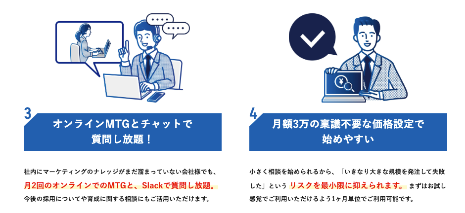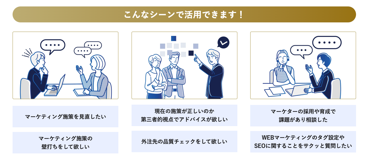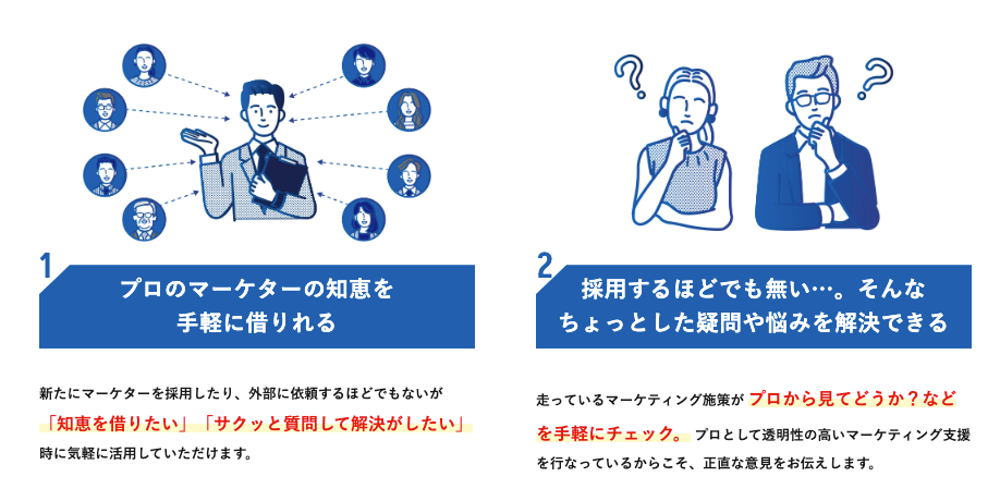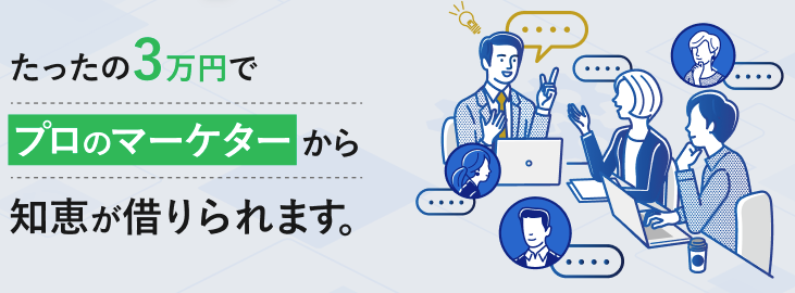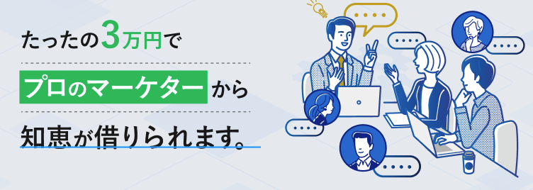 コンサルティングに依頼したり、新しく採用するほどではないが、「プロに聞きたいことが沢山ある」といった悩みを抱えている企業様には、月額3万円でお試しいただくことで、人材確保のリソースを軽減しながら、マーケティングに関する悩みを解決することができます。
