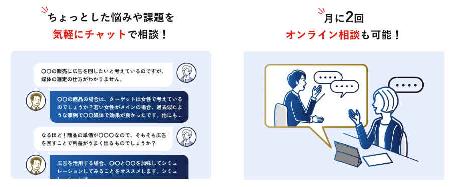 実際に今も現場で活躍しているプロのマーケターたちに、月に2度、ZoomやGoogleMeet等のオンライン上で直接ご相談が可能です。