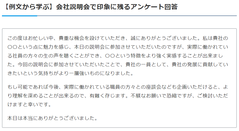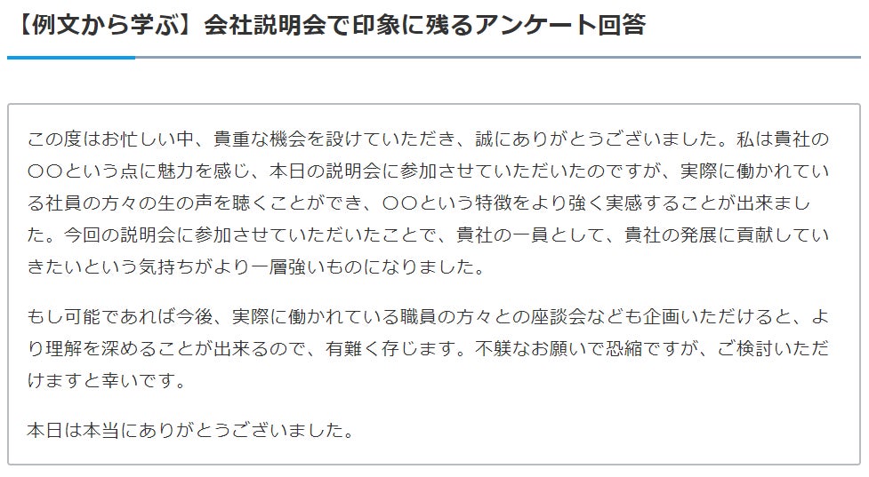 記事例2「会社説明会でどう書く?感想の書き方(例文付き)印象に残るアンケート回答」