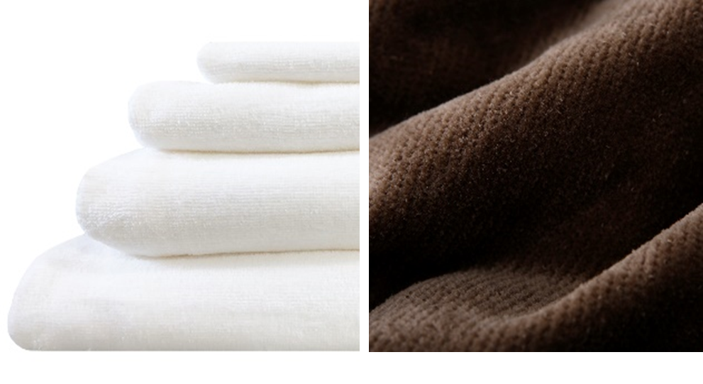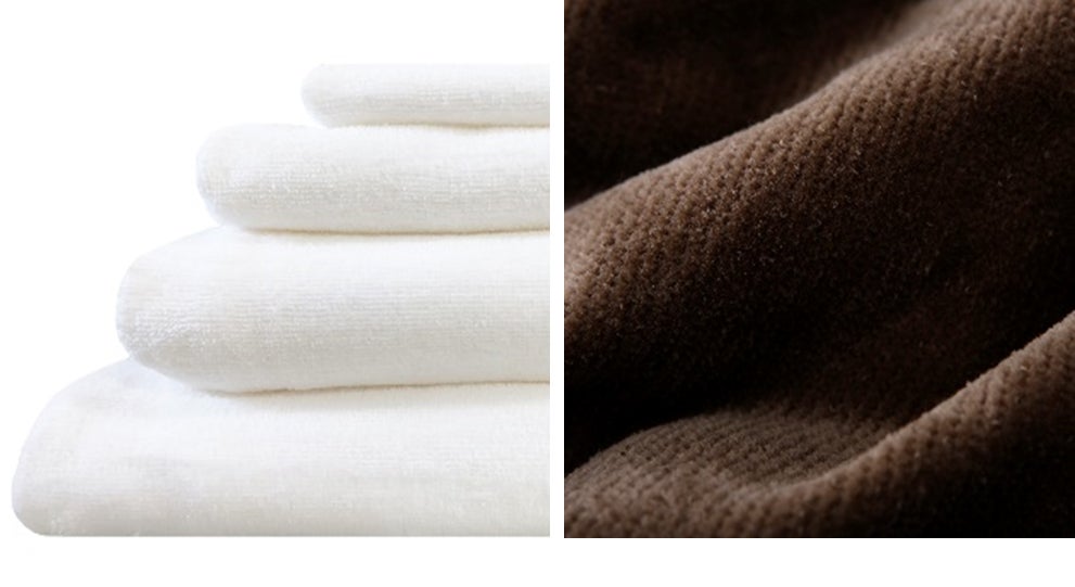 各写真内のタオルは、左側が300回洗濯後もしくは漂白剤使用後で、右側が加工なし(新品)です。