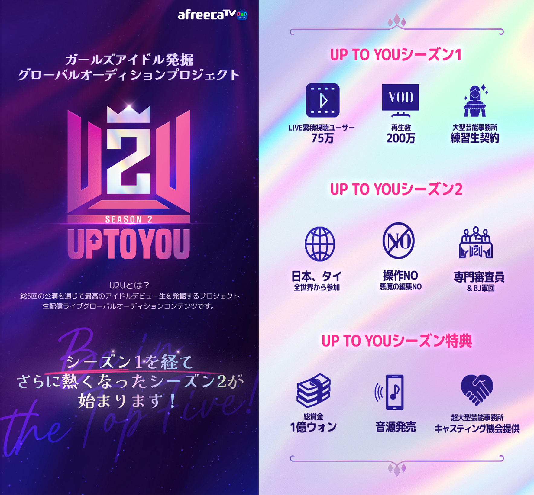 AfreecaTV(所在地:Republic of Korea、代表:Jung Chan Yong、以下、 アフリカTV)は、2023年5月31日(水)から毎週水曜日19時より、 5人組の女性アイドルを発掘するグローバルオーディションプロジェクト「UP TO YOU((以下U2U) SEASON2」を生配信することを発表した