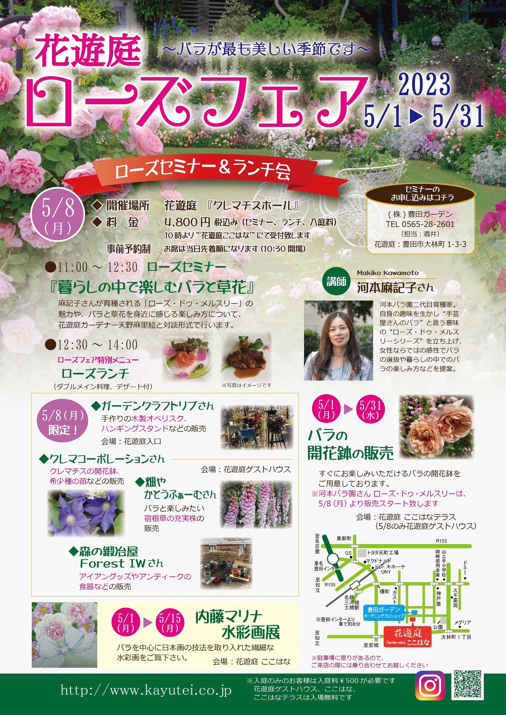 5月はローズフェアを開催し、バラの開花株の販売から、8日限定で、宿根草やクレマチス、ガーデニンググッズの販売もあります。