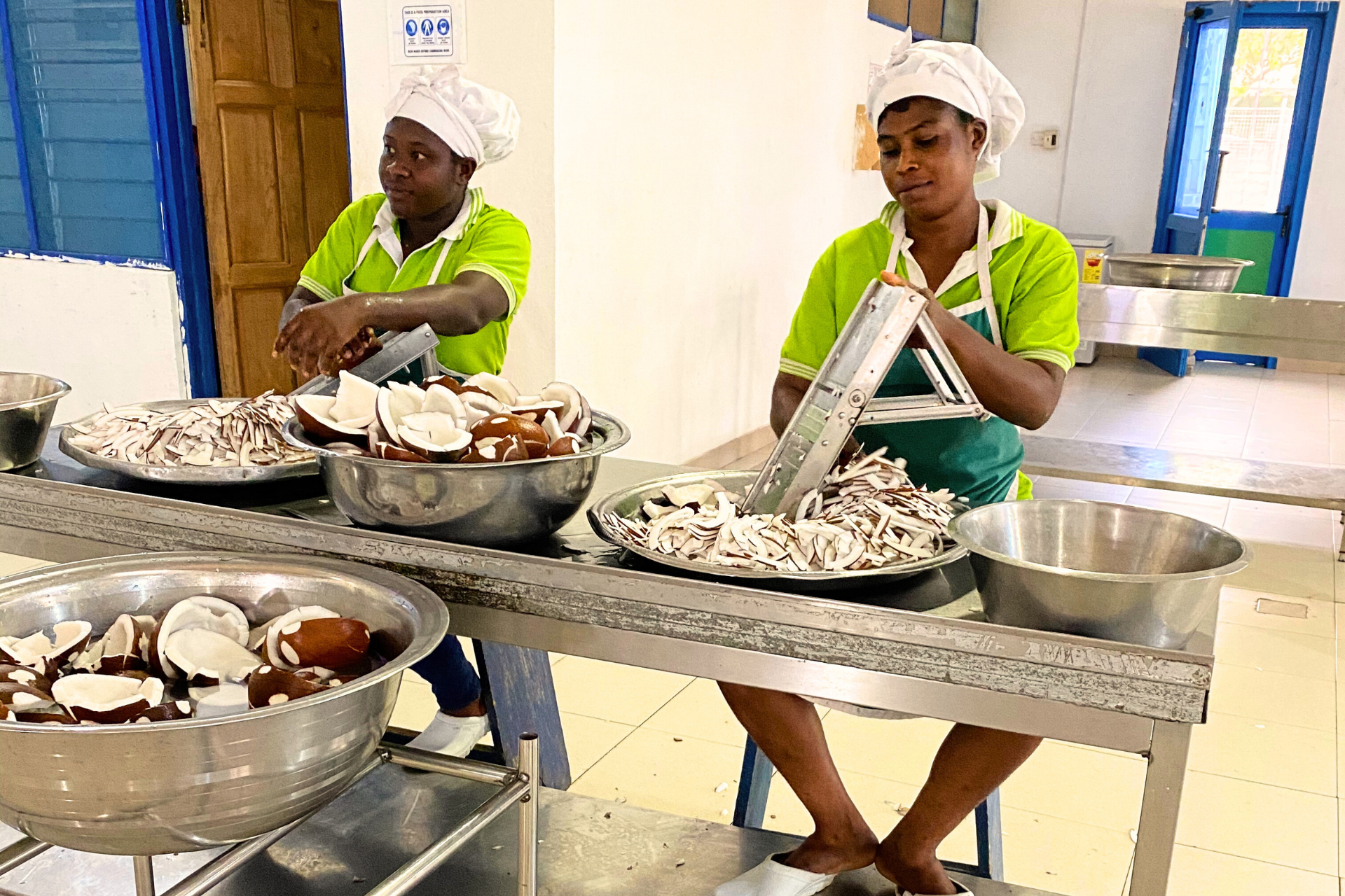 現地自社工場で働く女性たちが、1つ1つ丁寧に皮剥き、種抜き、カット、包装まで手作業で行います。