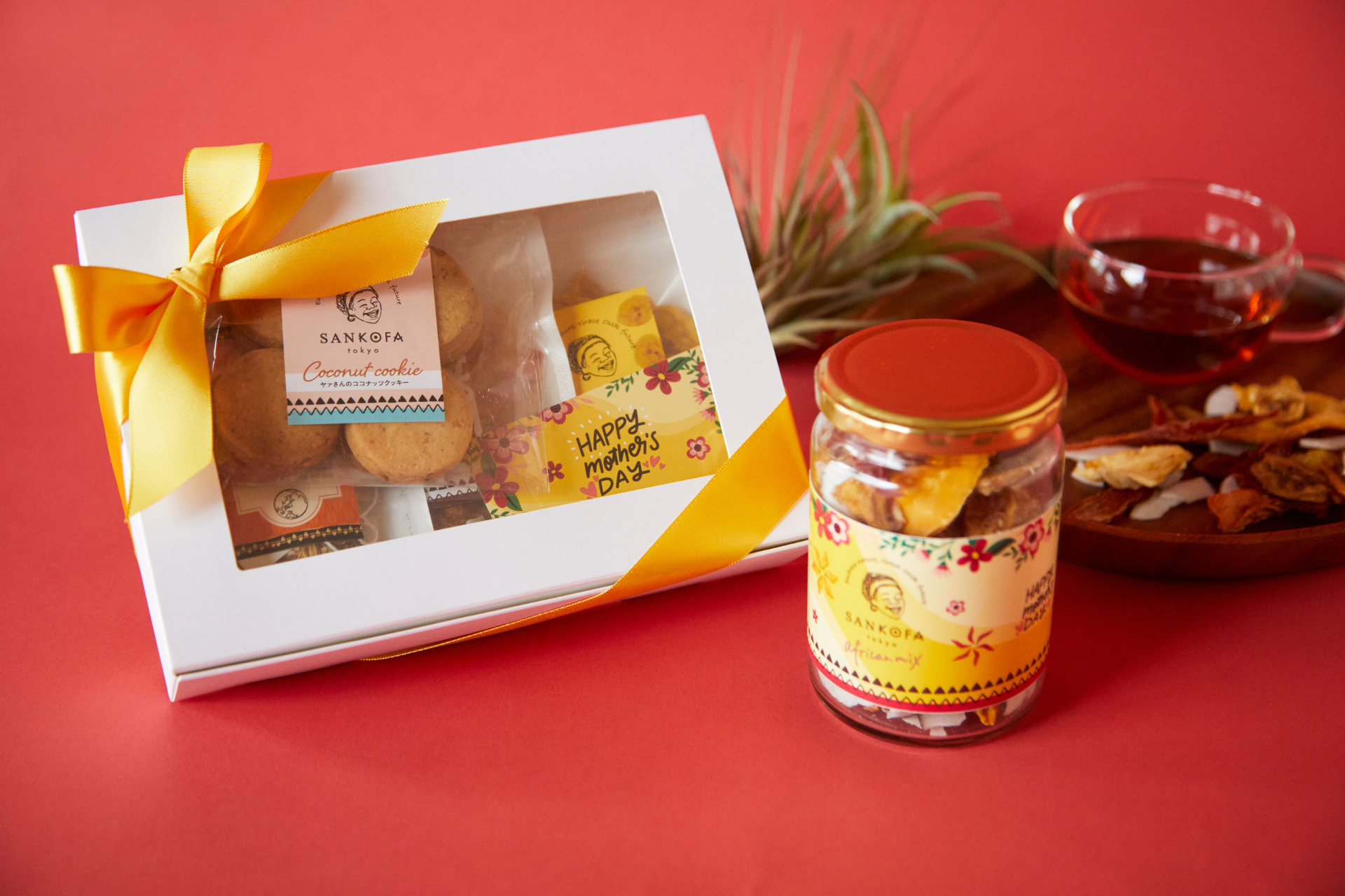 ドライフルーツ全5種類(飴色パイナップルを除く)、プランテンチップス、ハーブティー、ココナッツクッキーを楽しめます。忙しい女性が手軽に楽しめ、心も体も労わるのにピッタリな贈り物です。