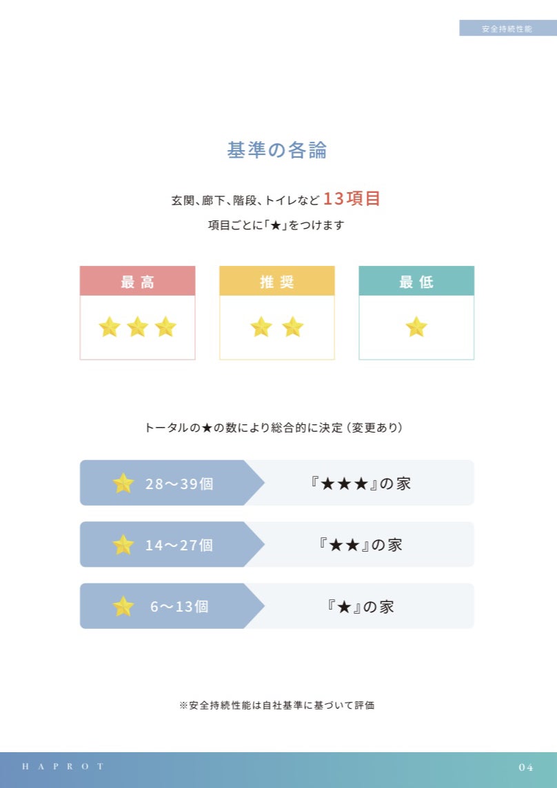 13項目それぞれに★を設定しており、最高は★★★、最低は★となっています。これの合計により『★★★』の家、『★★』の家、『★』の家と評価※2します。