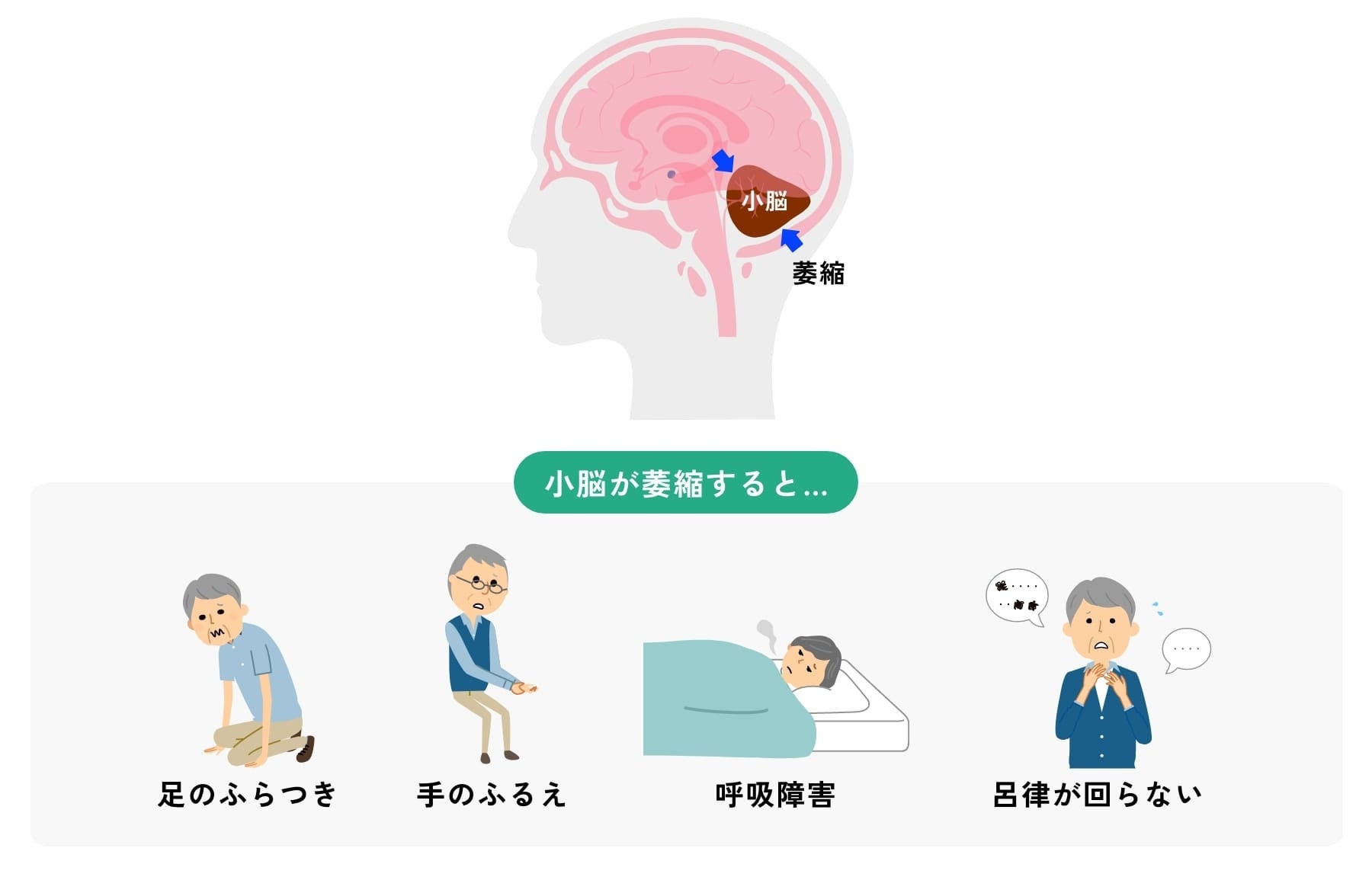 SCDでは主に小脳の神経細胞が徐々に減少することにより、運動がスムーズにできなくなる運動失調とよばれる症状が現れます。
