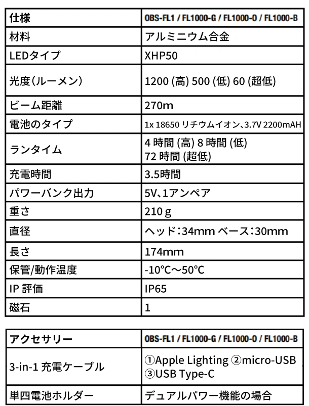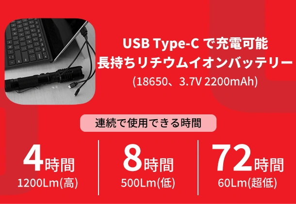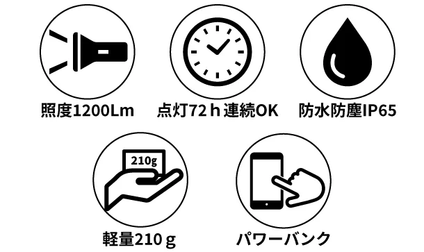 ②照度1200Lm:どんな時も明るく。点灯72h連続※:大容量で心強い。軽量210g:コンパクト