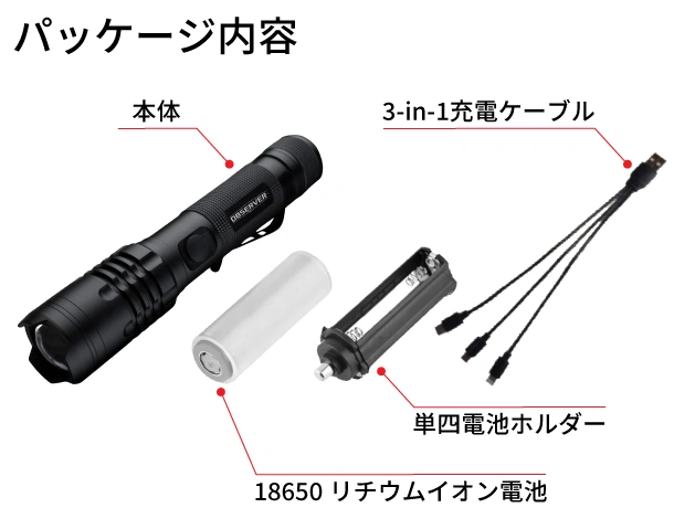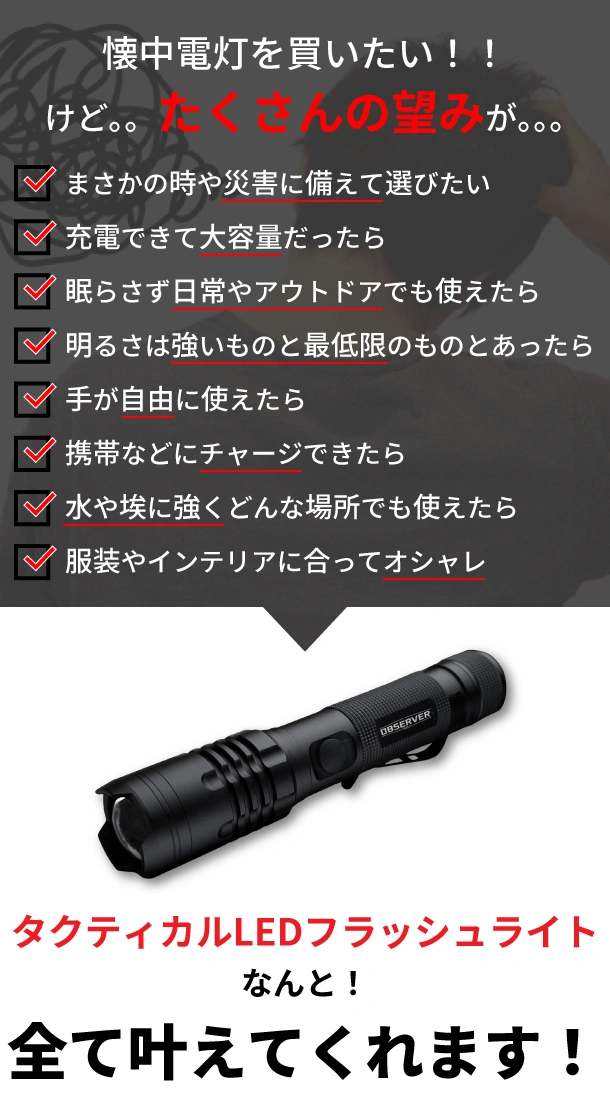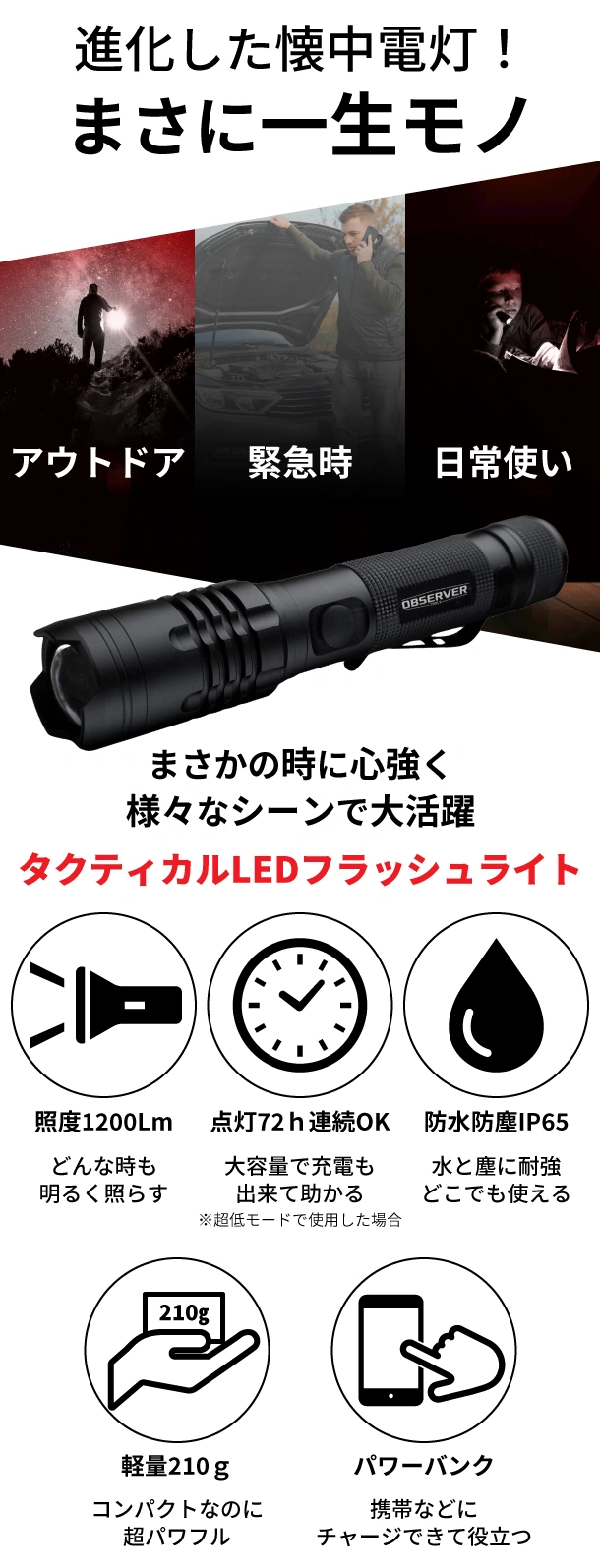 「OBSERVER TOOLS」タクティカルLEDフラッシュライトは災害の多い日本で重宝する商品であると思います。災害時には、通常の充電器が使えなくなる可能性があるため、急な停電などでも単四電池で使用できるパワーバンク内蔵の懐中電灯はスマートフォンやタブレットなどの電子機器を充電できることはとても重要な事です。