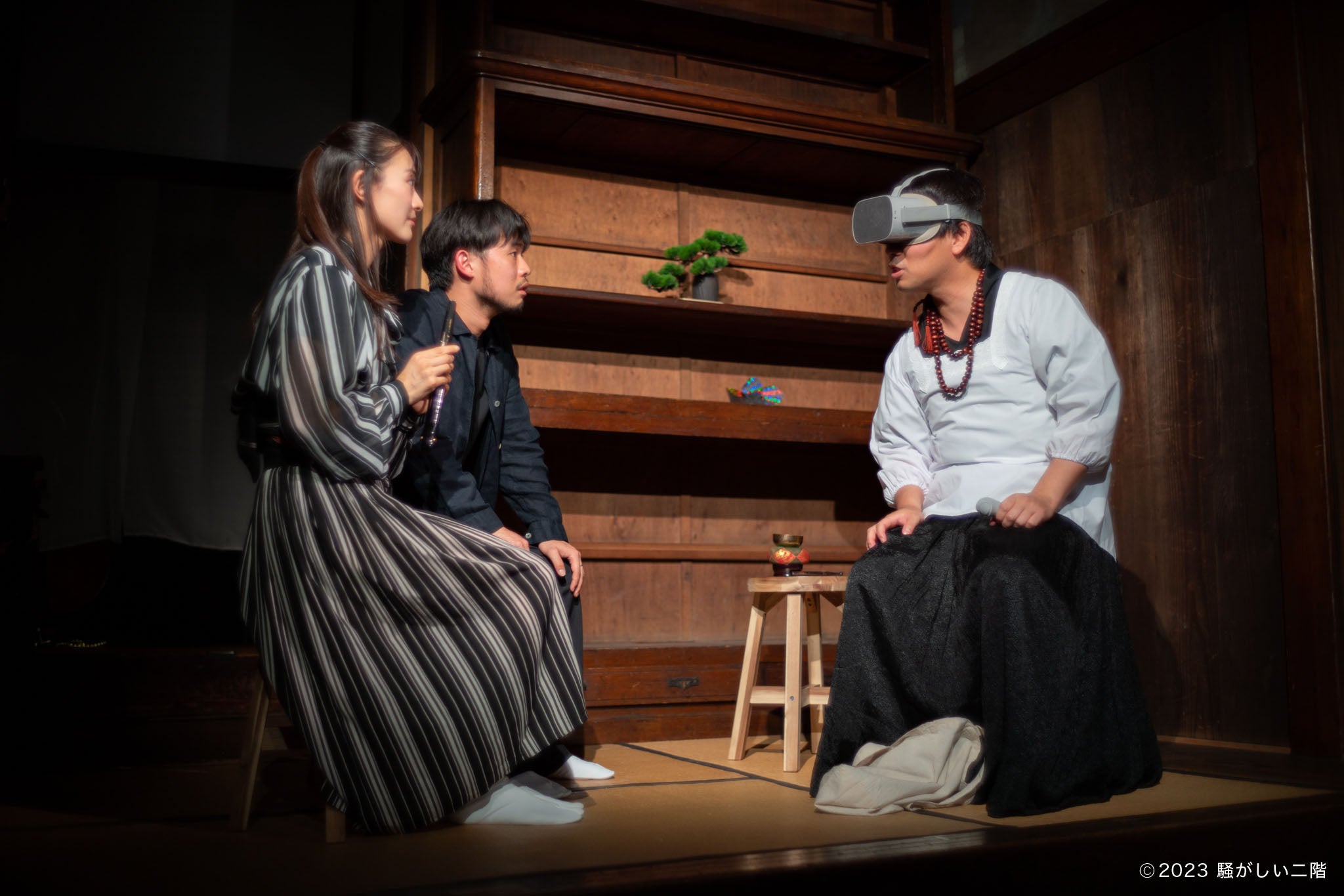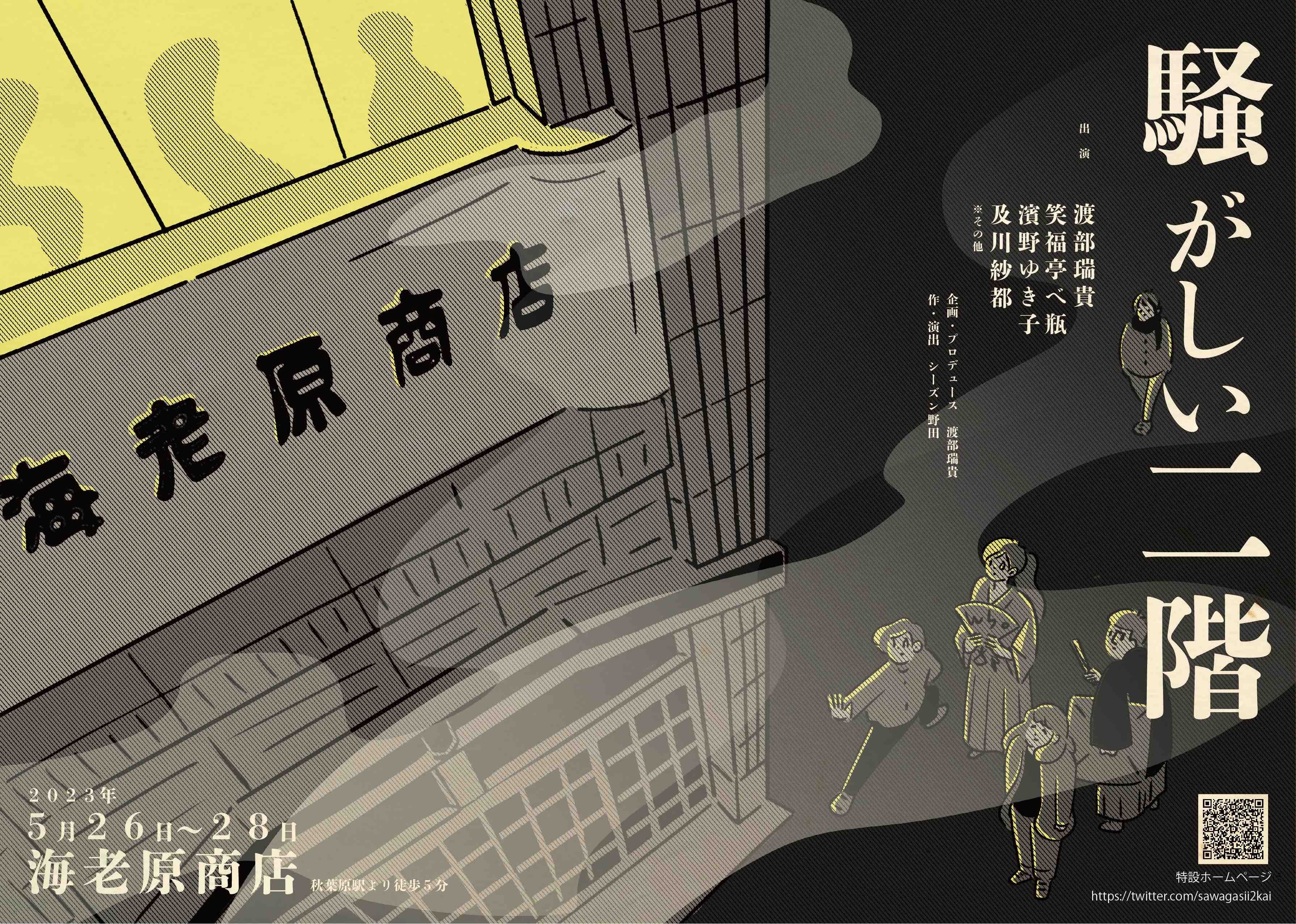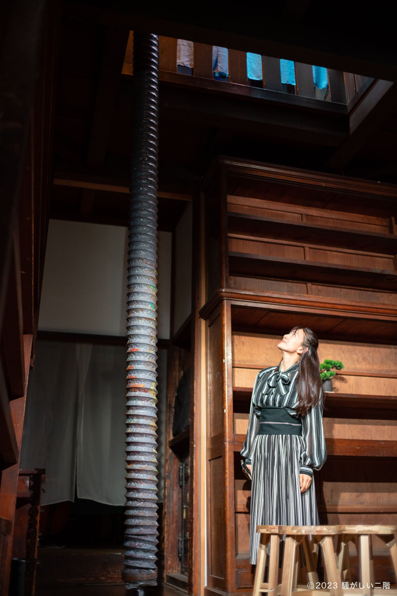 2023年5月に上演された「騒がしい二階」は、プロジェクト第1作目となる長編演劇であり、歴史的建造物「海老原商店」とのコラボレーションです。