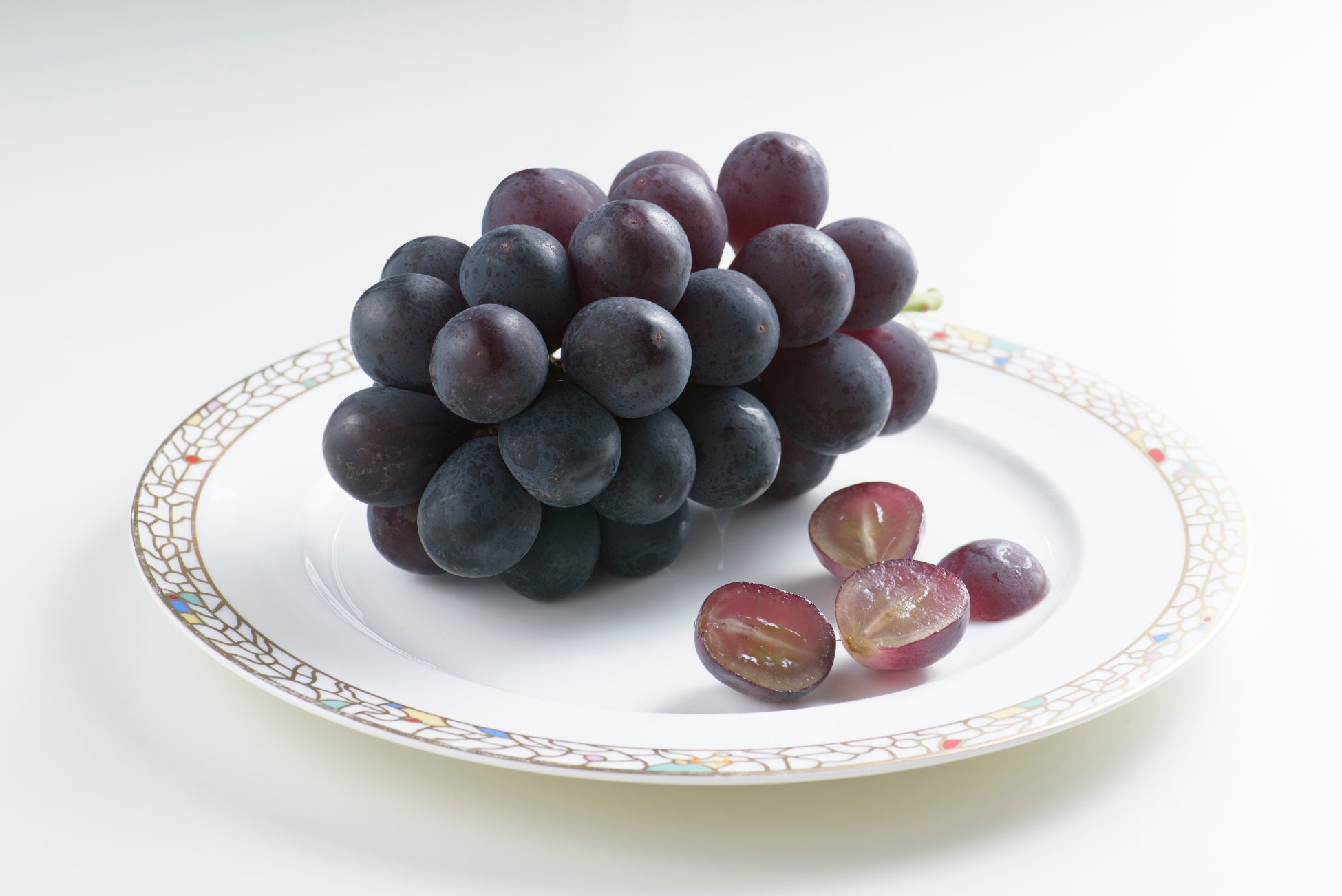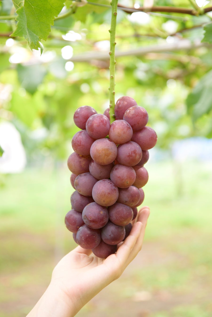 「石原早生」と「センテニアル」を交配したもので、昭和20年(1945年)に命名されました。今では黒ぶどうの定番品種となっています。果皮が濃い紫黒色をしていて、果肉は淡い緑色。締まりがある果肉は甘さも十分、果汁も多く優れた食味です。