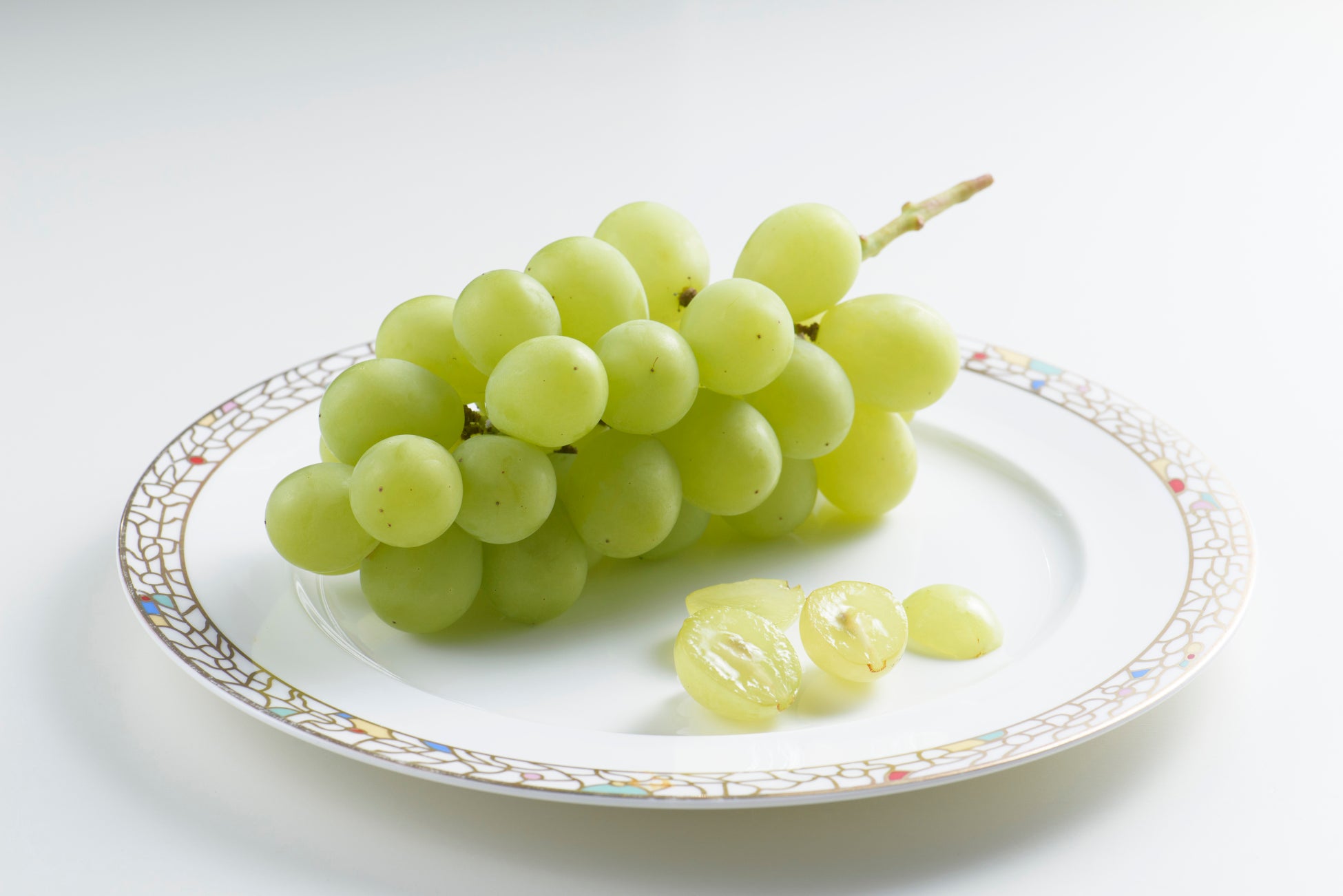色はマスカットのような黄緑色です。巨峰の自然交雑実生から育成され、一般的に糖度は巨峰と同程度か少し高いですが、巨峰独特の酸味が少ないです。糖度が高い割にはしつこくなく、さっぱりとした甘味が特徴です。食べ始めると、くせになる味で、やめられなくなり、特に女性の人気が高く、口コミで評判が広がり、常陸太田市で人気の高いぶどうの一つになりました。