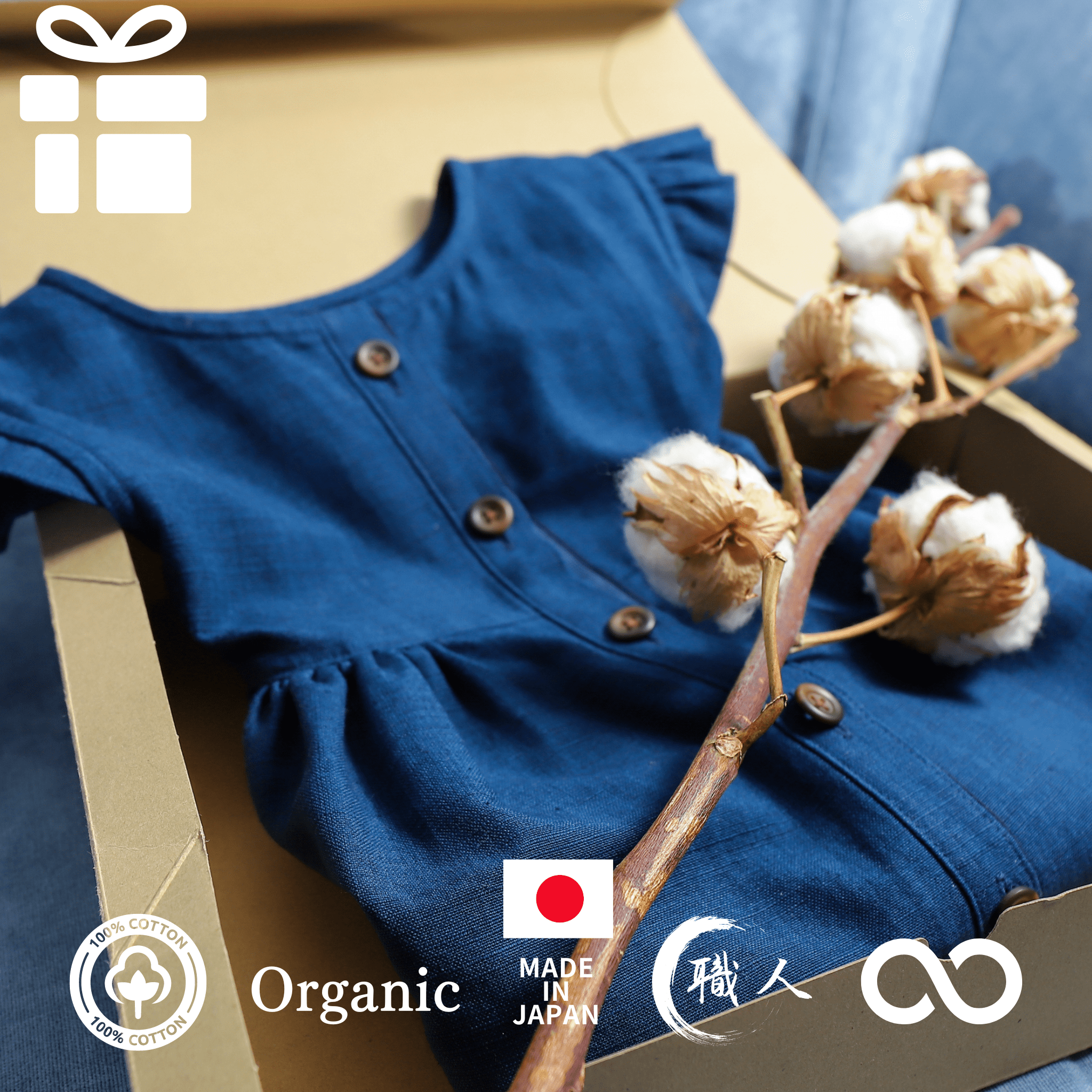 日本三大絣の一つで日本を代表する伝統的先染め織物の久留米絣は上品で丈夫です。1800年代に日常着として広まった久留米絣は【30以上の工程の多くを手作業】でおこないます。カスリキッズで使用する生地は厚手の綿100%のため、夏涼しく冬暖かいという魔法のような綿の素材が活かされ一年を通して着て楽しむことができます。