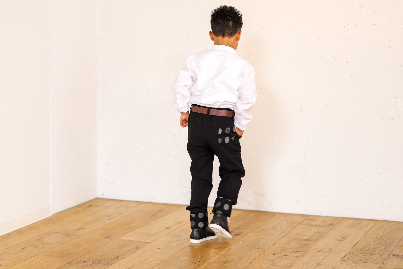 15㎝ある裾を伸ばすことで長く着続けていただけるユニセックスパンツ。裾とポケットに久留米絣の特徴である柄を入れました。また、よく穴があいてしまう膝裏は二重構造に。裏生地に柄生地を入れることで膝が破れると裾やポケットと同じ柄が見えるようにしました。男の子と女の子の両方が自信を持って着用できる細身のデザイン。久留米絣の丈夫な作りは活発な子どもたちにぴったりです!