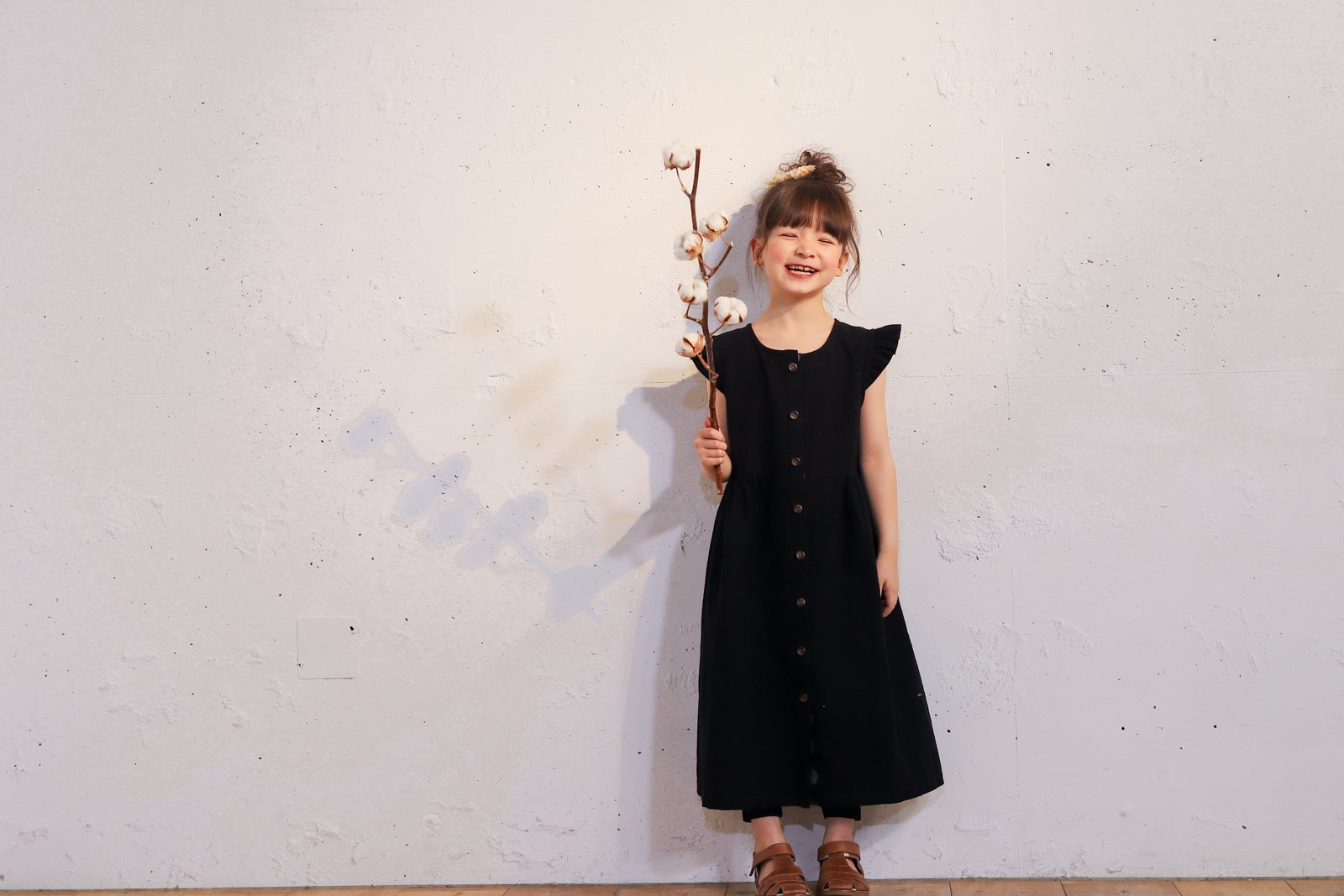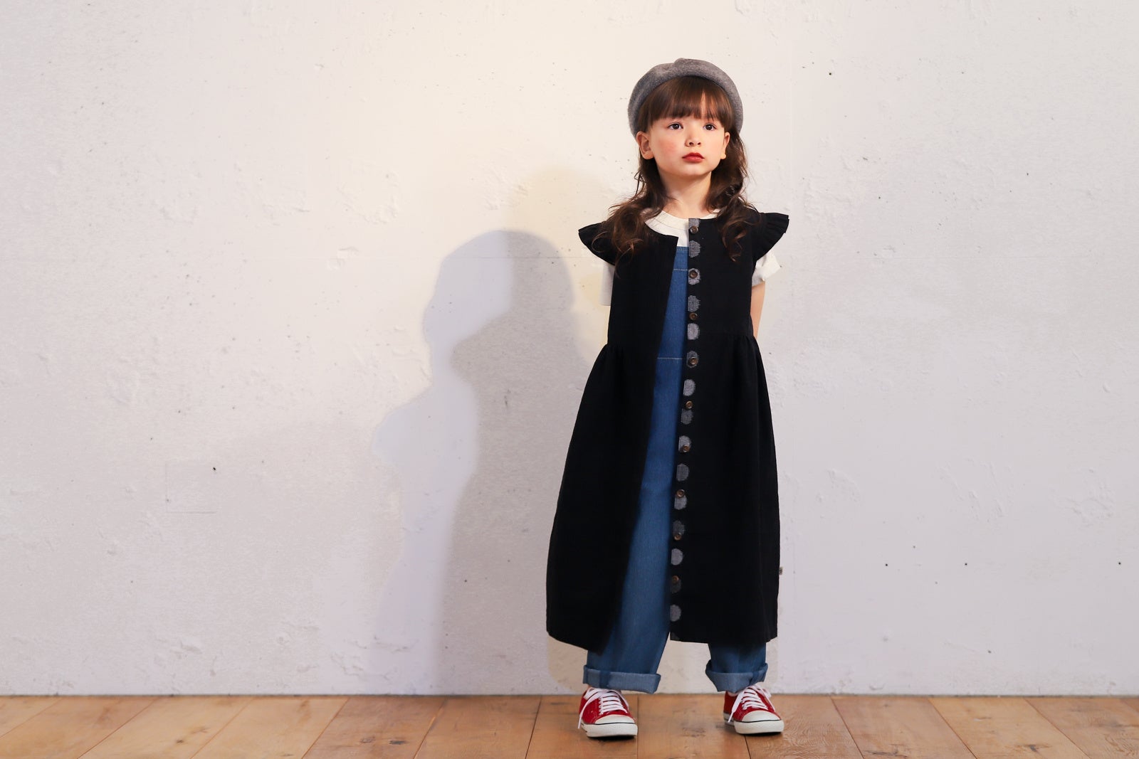 2歳と7歳のモデルが着ている3wayワンピースはどちらもSサイズ(90-110size)。2歳でも引きずらないかわいい丈感と7歳でも動きやすい腕回りのサイズにこだわりました。
