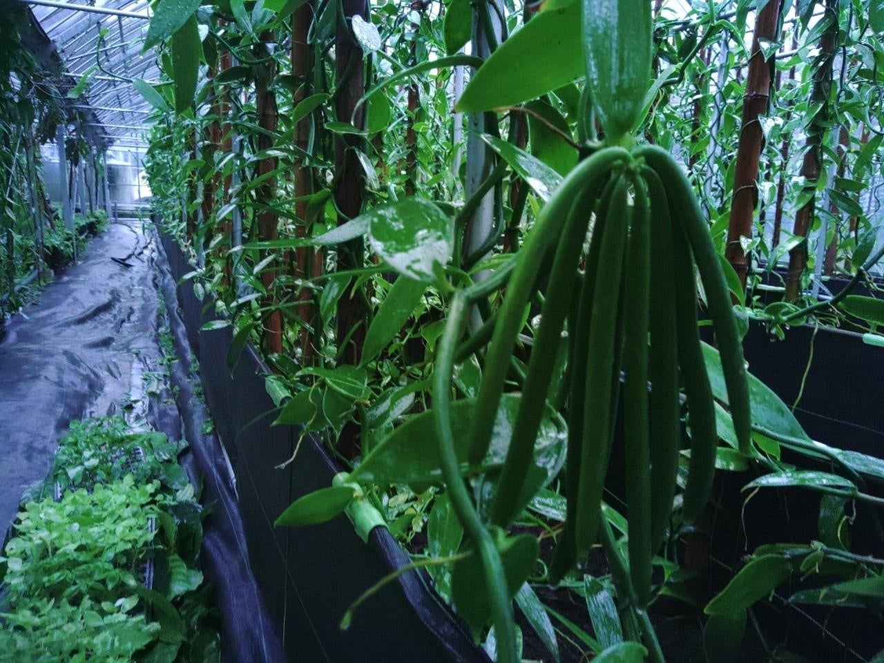 海外では原産国メキシコ、最⼤輸出国インドネシア、最⾼品質とされるマダガスカルを中⼼にバニラ栽培が⾏われています。⽇本では⽷満や読⾕などで栽培されています。近年は栽培を始める農家が増えています。バニラは栽培技術、特に発酵技術が重要です。ブルボンバニラは最高級とされますが、その発酵技術はほとんど科学化されておらず、世界的にも謎とされてきました。