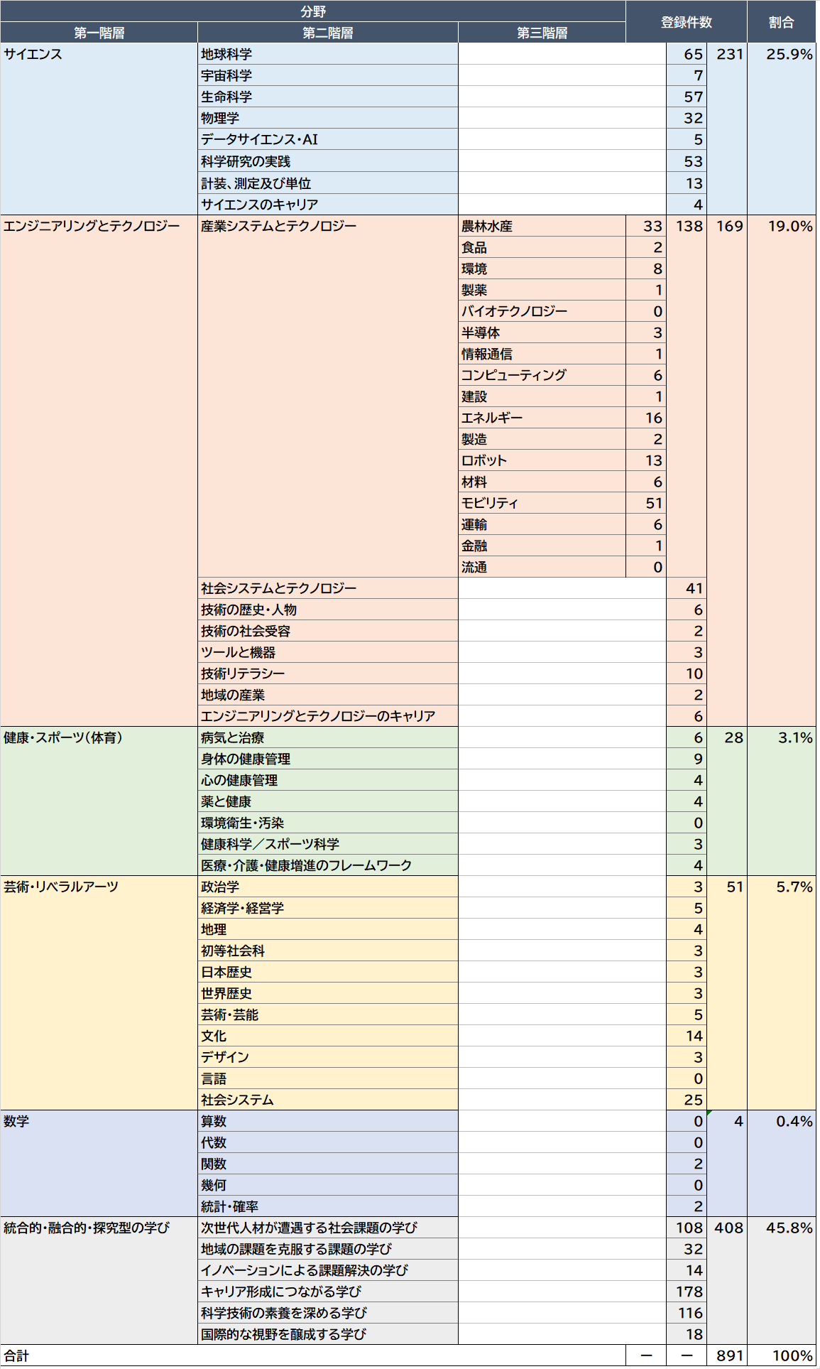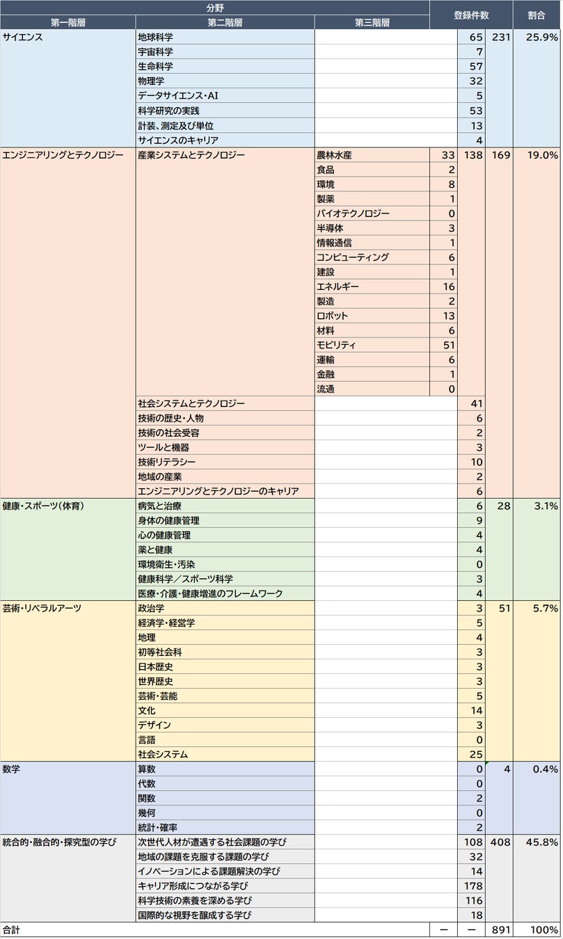 三つ目の特徴は、幅広い分野構成を持つウェブシステムである点になります。第一階層として、「サイエンス」「エンジニアリングとテクノロジー」「健康・スポーツ(体育)」「芸術・リベラルアーツ」「数学」「統合的・融合的・探究型の学び」を有し、最大第三階層まで構成されています(表2参照)。第一階層の分野における件数・割合は、運用開始時点、サイエンス(件数:231、割合:25.9%)、エンジニアリングとテクノロジー(件数:169、割合:19.0%)、健康・スポーツ(体育)(件数:28、割合:3.1%)、芸術・リベラルアーツ(件数:51、割合:5.7%)、数学(件数:4、割合:0.4%)、統合的・融合的・探究型の学び(件数:408、割合:45.8%)となっています。登録件数に偏りがある点は改善を図っていく予定であり、特に、「健康・スポーツ(体育)」「芸術・リベラルアーツ」「数学」は登録件数が少なく、今後、広く収集を継続して参ります。