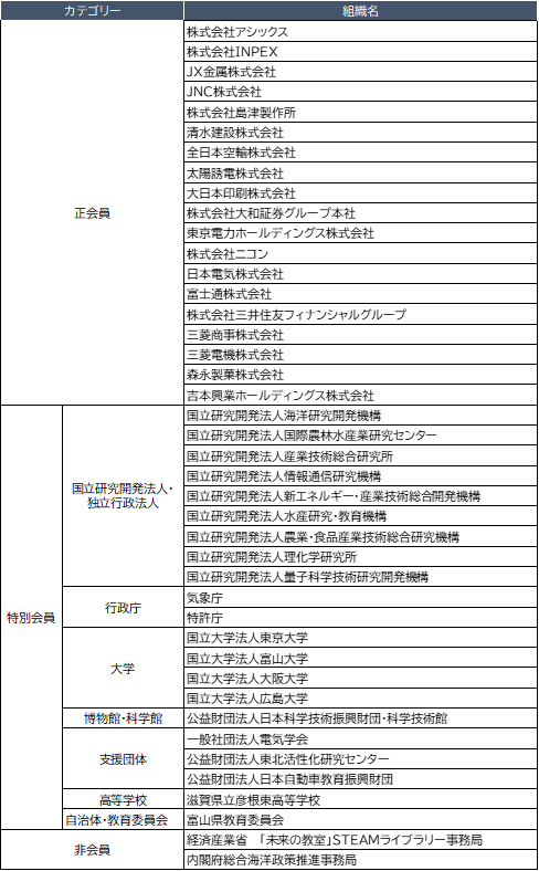 2023年4月1日現在、34の正会員(企業)と、321の特別会員(中学、高校、高専、大学、行政庁、国立研究開発法人・独法、自治体・教育委員会、博物館・科学館、支援団体)をはじめとする多様なステークホルダーと連携しながら、上述のミッションに日々取り組んでいる。
