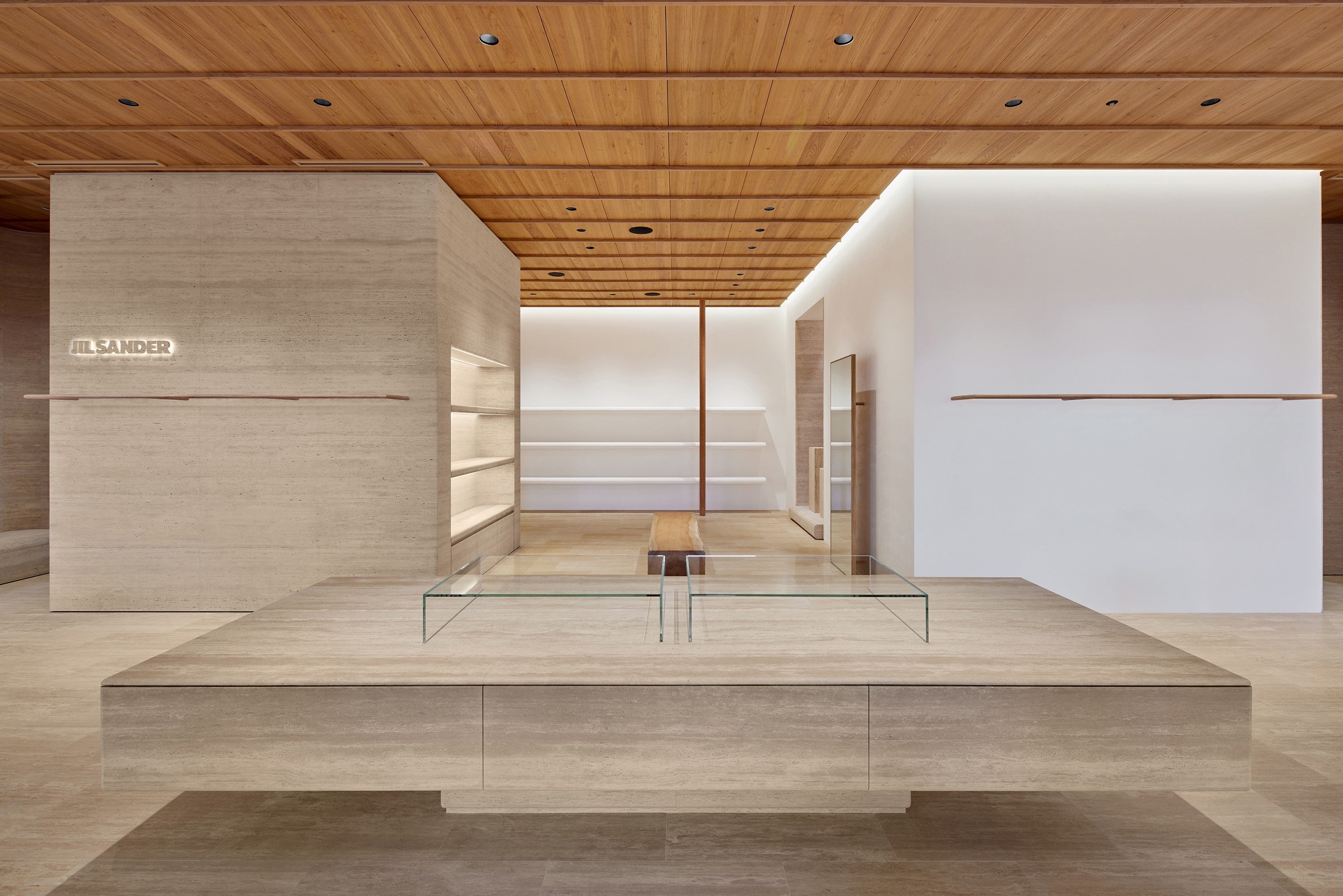 柱やハンガーラックには木材を使用、天井も木で組まれ、壁の一部は漆喰で仕上げられています。長屋を思わせる空間は、この地域の伝統的な様式を明確に意識しているものです。対照的に、床と壁、ベンチやディスプレイ棚は、ジル サンダーの本社そしてデザインの拠点があるミラノをはじめ、北欧で使用されている岩石、トラバーチンでつくられています。このプロジェクトは、ルーシー&ルーク・メイヤーの指揮のもと、ブランドが世界中にオープンする店舗のビジョンから発展したのものです。このビジョンは、シンプルかつ繊細なデザインへのアプローチによって導かれ、店舗がある場所の文化遺産と、光、線、素材の完璧なリズムを融合することで美的バランスを見出しています。