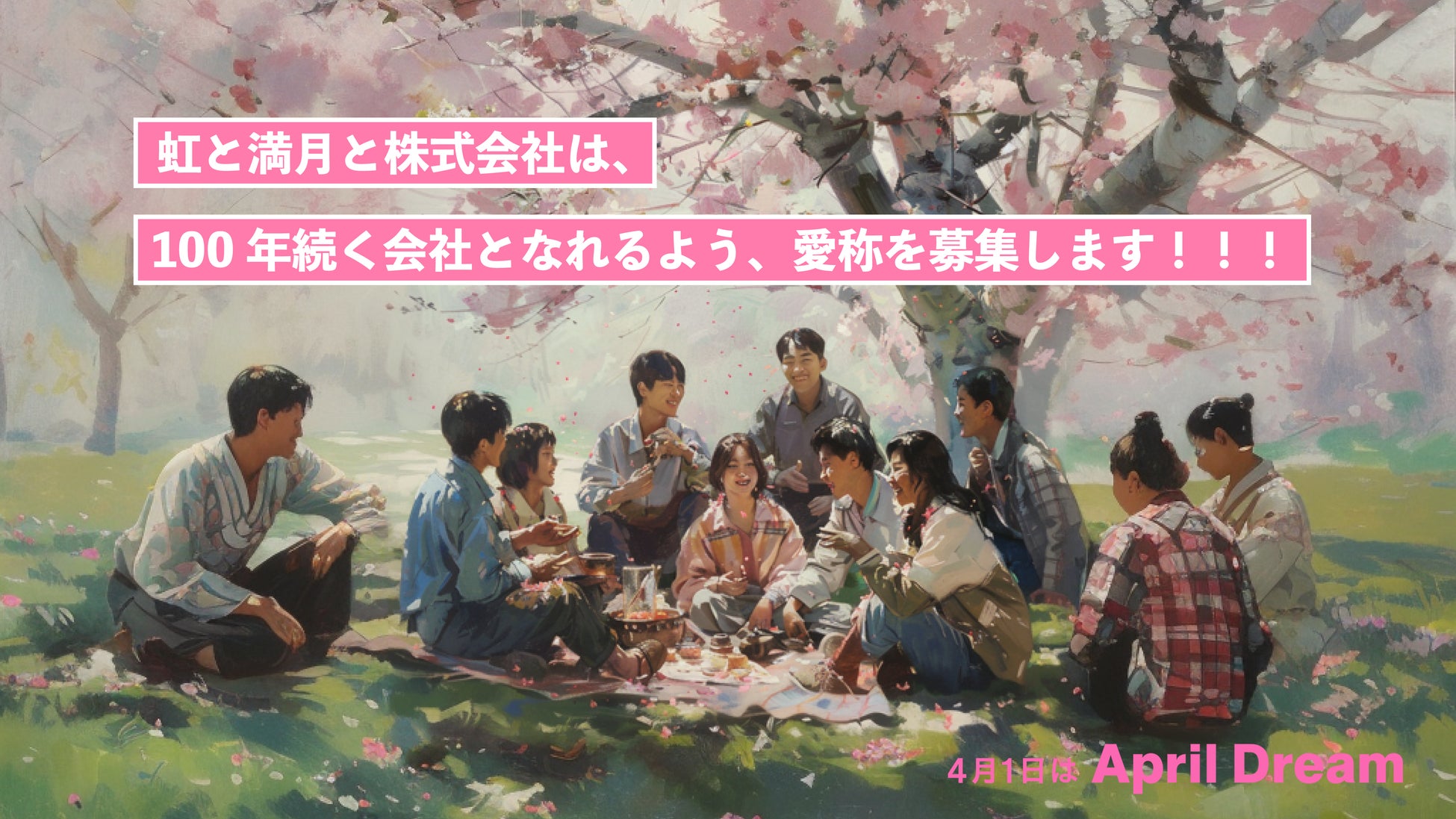 Z世代に特化した企画・PR・マーケティングを行う「虹と満月と株式会社」(本社:東京都中野区 / CEO:西村海都)は、2期目を迎える2024年4月1日より、これから100年続く会社となれるよう、愛称を募集します!!!当社は、4月1日を夢を発信する日にしようとするApril Dreamに賛同しています。このプレスリリースは「虹と満月と私たち」の夢です。