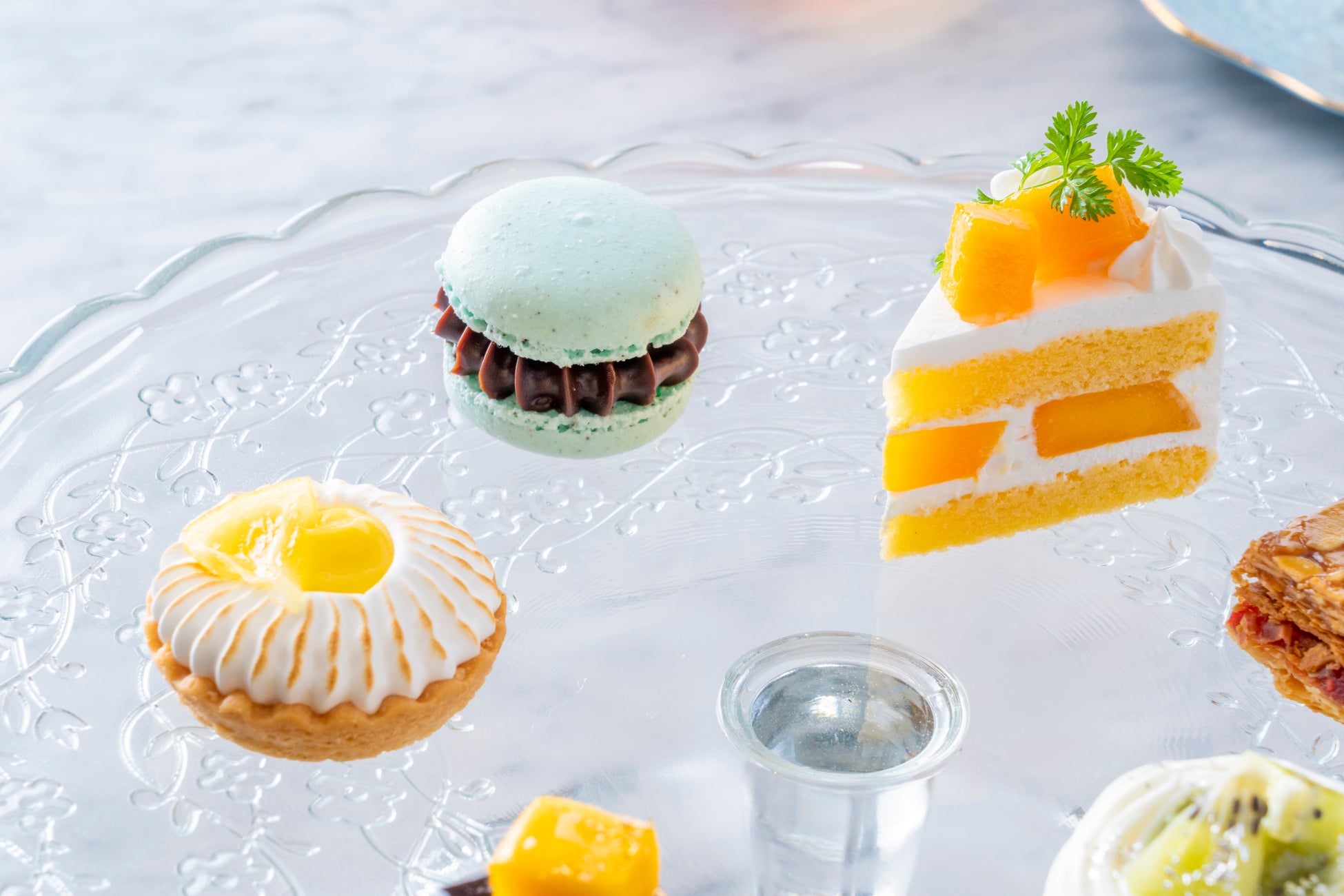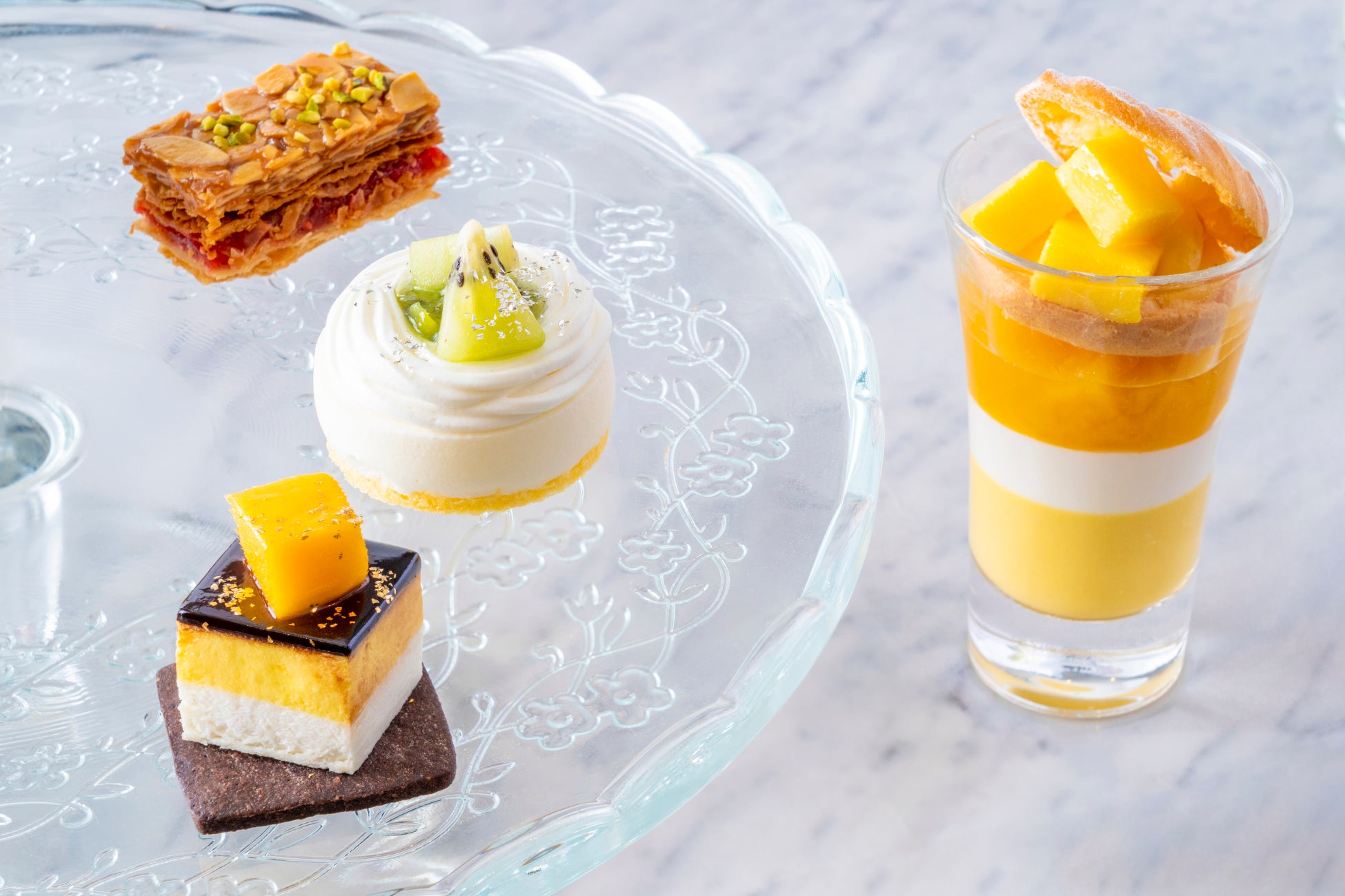 デザートには、マンゴーをたっぷりサンドしたショートケーキや、ココナッツクリームやマンゴープリンのパフェ、糖度の高いアルフォンソマンゴーとチョコレートを合わせたムースなどを用意いたしました。その他、上品な味わいのキウイのレアチーズケーキや、ダークチョコレートと合わせたチョコミントマカロンなど、8種類がラインナップ。