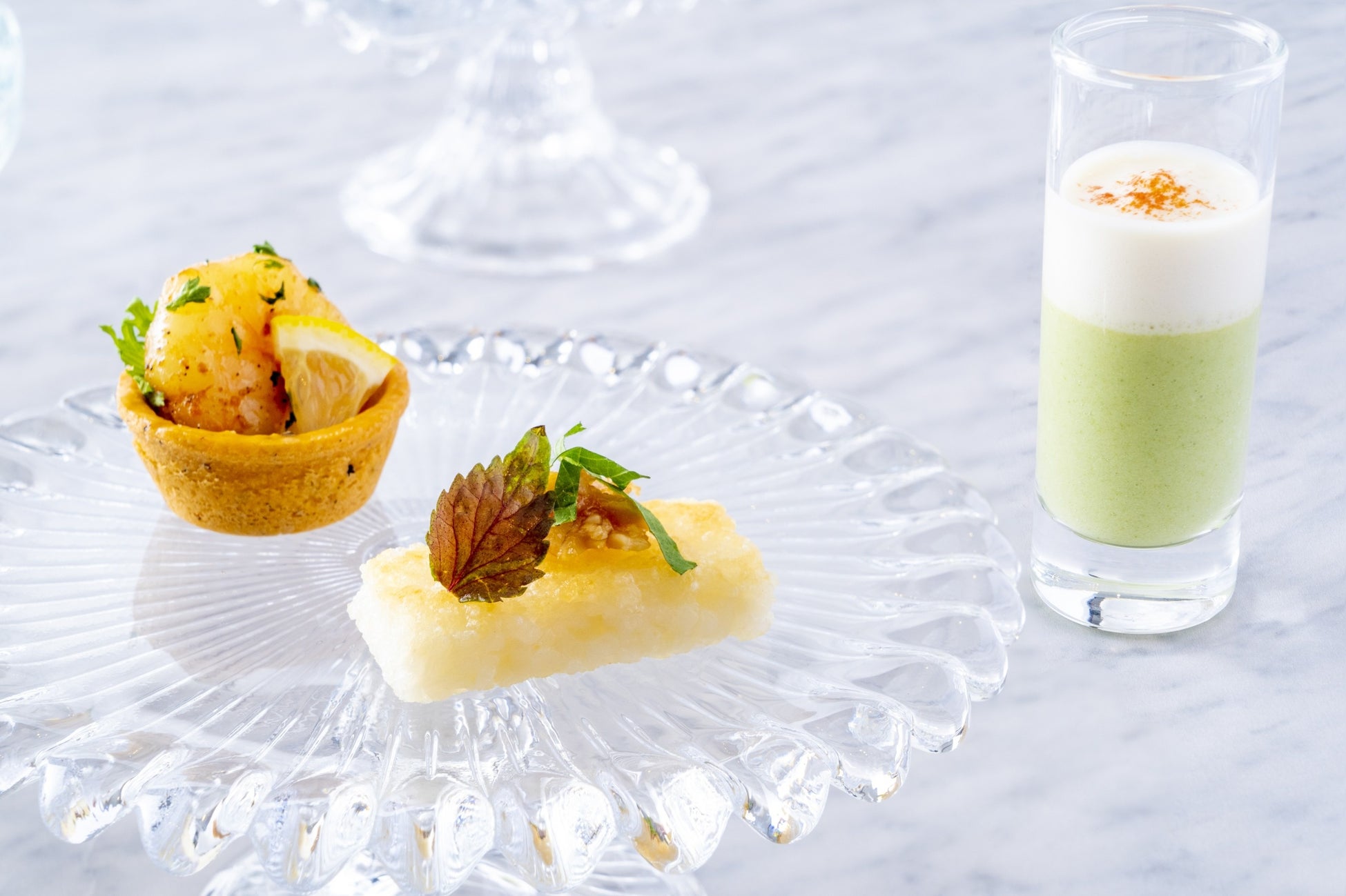 セイボリーには、10種類のスパイスで一晩漬けこみ下味をつけ、マンゴーサルサと合わせたフライドチキンや、千葉県産ピーナッツを使用した自家製ピーナッツ味噌を添えた焼きリゾットが登場。さらにホワイトコーンの甘みを活かしたとうもろこしのムースや、枝豆を豆乳のエスプーマと合わせた冷製スープなど、6種類をご用意しました。
