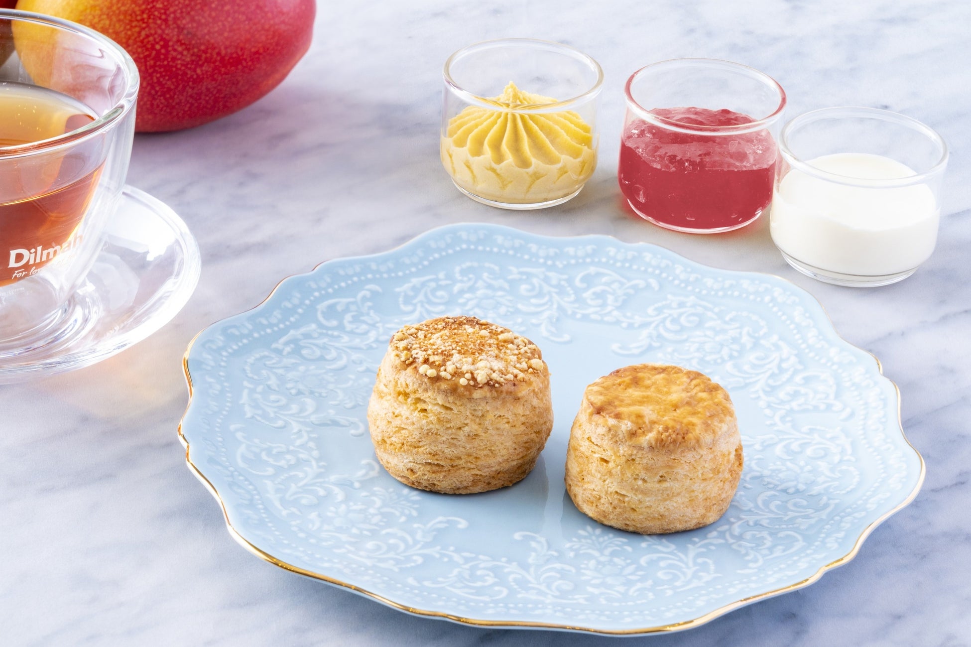 外はサクッと中はしっとりとしたスコーンは、バターたっぷりのプレーンに加え、以前好評いただいたオリーブオイル&パルメザンチーズスコーンの2種類をご用意しました。パルメザンチーズの香ばしさを楽しんでいただけます。コンディメントには、クロテッドクリームの他、コンポートした桃に、ライチの爽やかな風味を合わせた桃のコンポートとライチのジャムと、マンゴーラッシークリームをご用意しました。お好きな組み合わせでお楽しみください。