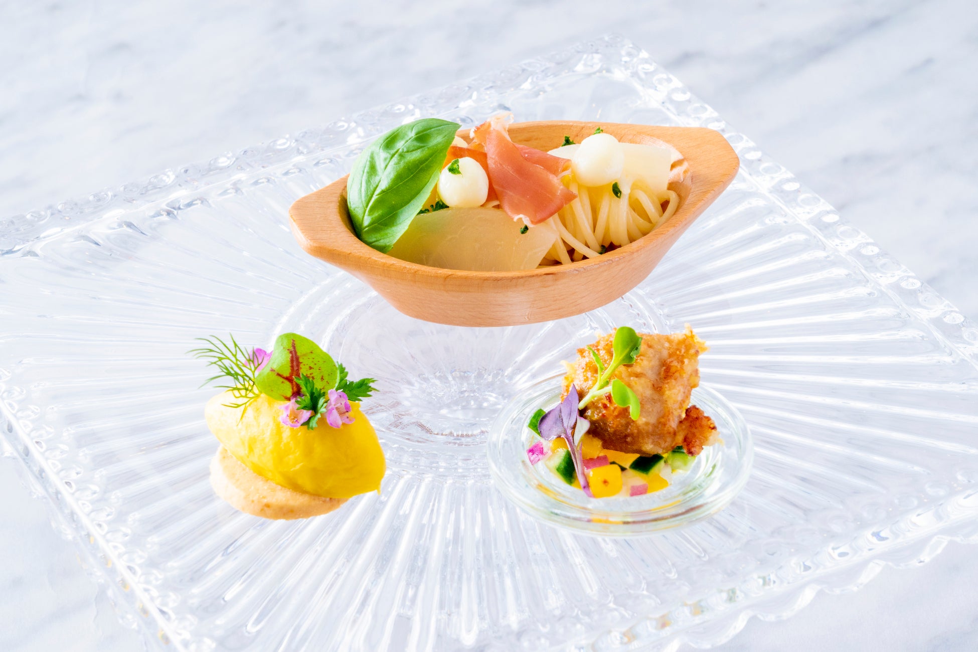 じゅわっと瑞々しい桃のカッペリーニです。甘みの強いホワイトバルサミコと、トッピングの生ハムの塩味でバランス良く仕上げています。夏の清涼感を味わっていただけます。