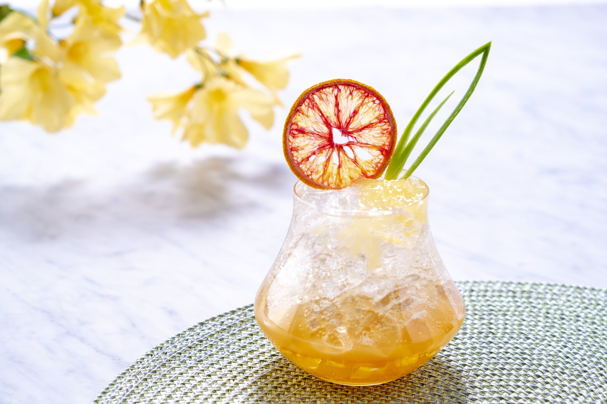 真夏のきらめく海に沈んでいく、夕日のようなグラデーションが美しいモクテルです。濃厚なマンゴーピューレを爽やかなライチジュースと合わせました。ぷるぷる食感のパイナップルのジュレと飲むと、トロピカルフルーツのフルーティーな味わいを存分に堪能いただけます。すっきりとした後味、アフタヌーンティーのお食事にもぴったりです。
