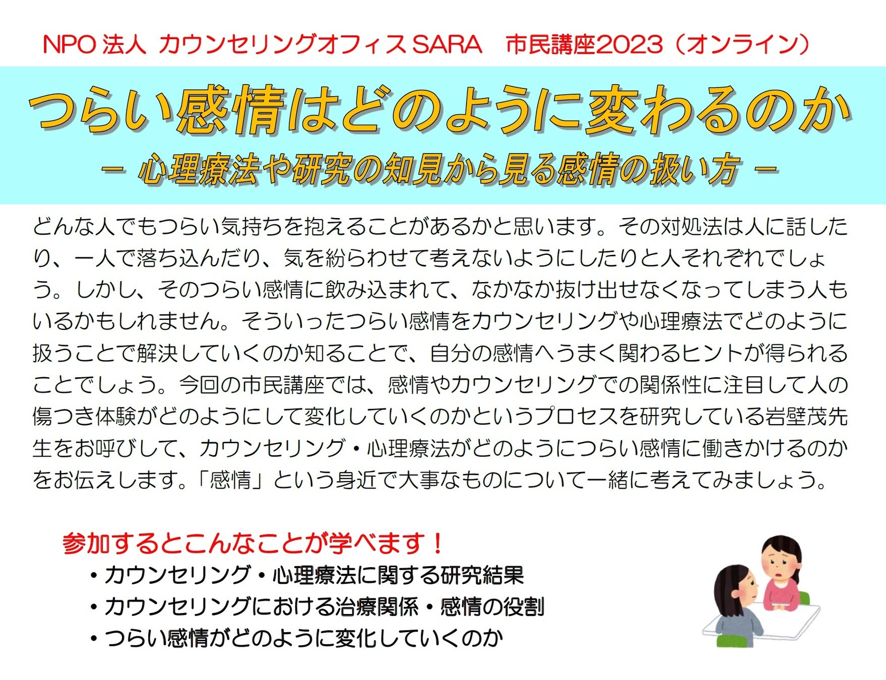 今回の市民講座では、感情やカウンセリングでの関係性に注目して人の傷つき体験がどのようにして変化していくのかというプロセスを研究している岩壁茂先生をお呼びして、カウンセリング・心理療法がどのようにつらい感情に働きかけるのかをお伝えします。「感情」という身近で大事なものについて一緒に考えてみましょう。
