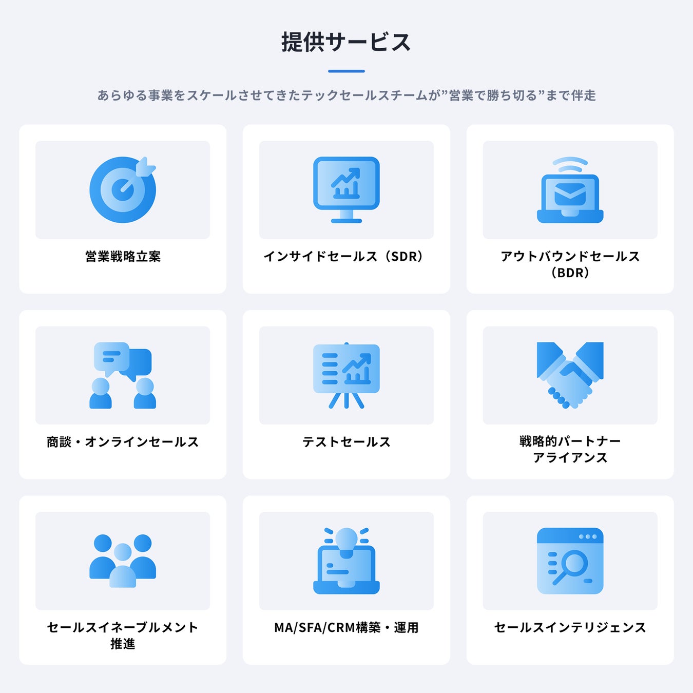 豊富な営業経験を持つテックセールス人材が、顧客課題に合わせて最適なチームを編成し、顧客インサイトの特定から営業戦略立案、セールステックツールを活用した実行・全てのSales Ops領域までを伴走サポート致します。