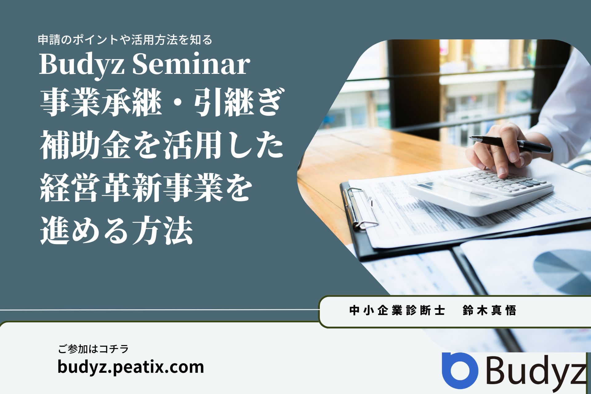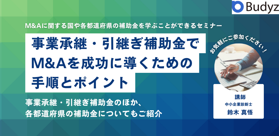 M&A・事業承継を予定している方必見!事業承継・引継ぎ補助金 経営革新事業のご申請を検討している方向けのセミナーを開催(→budyz.peatix.com)
