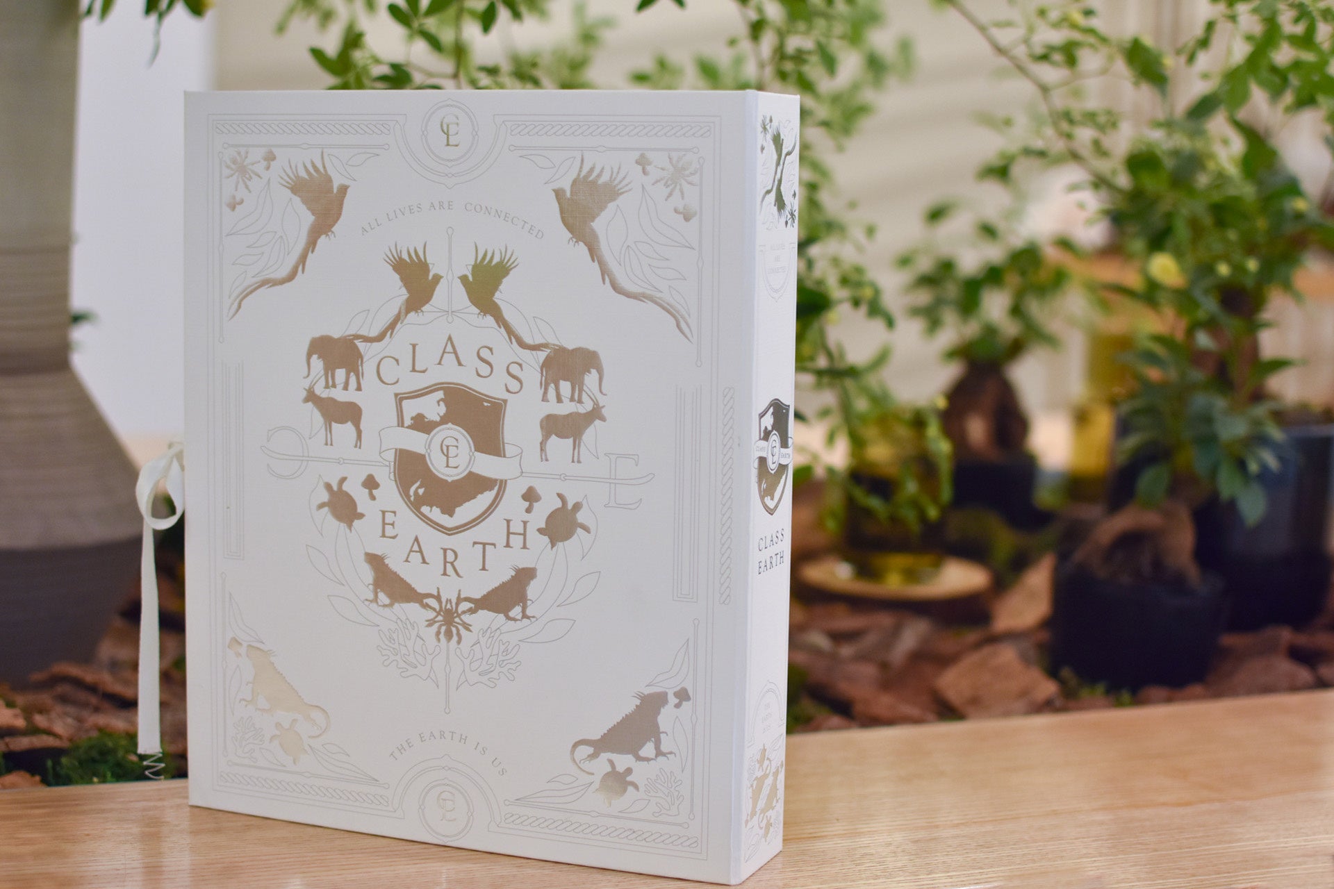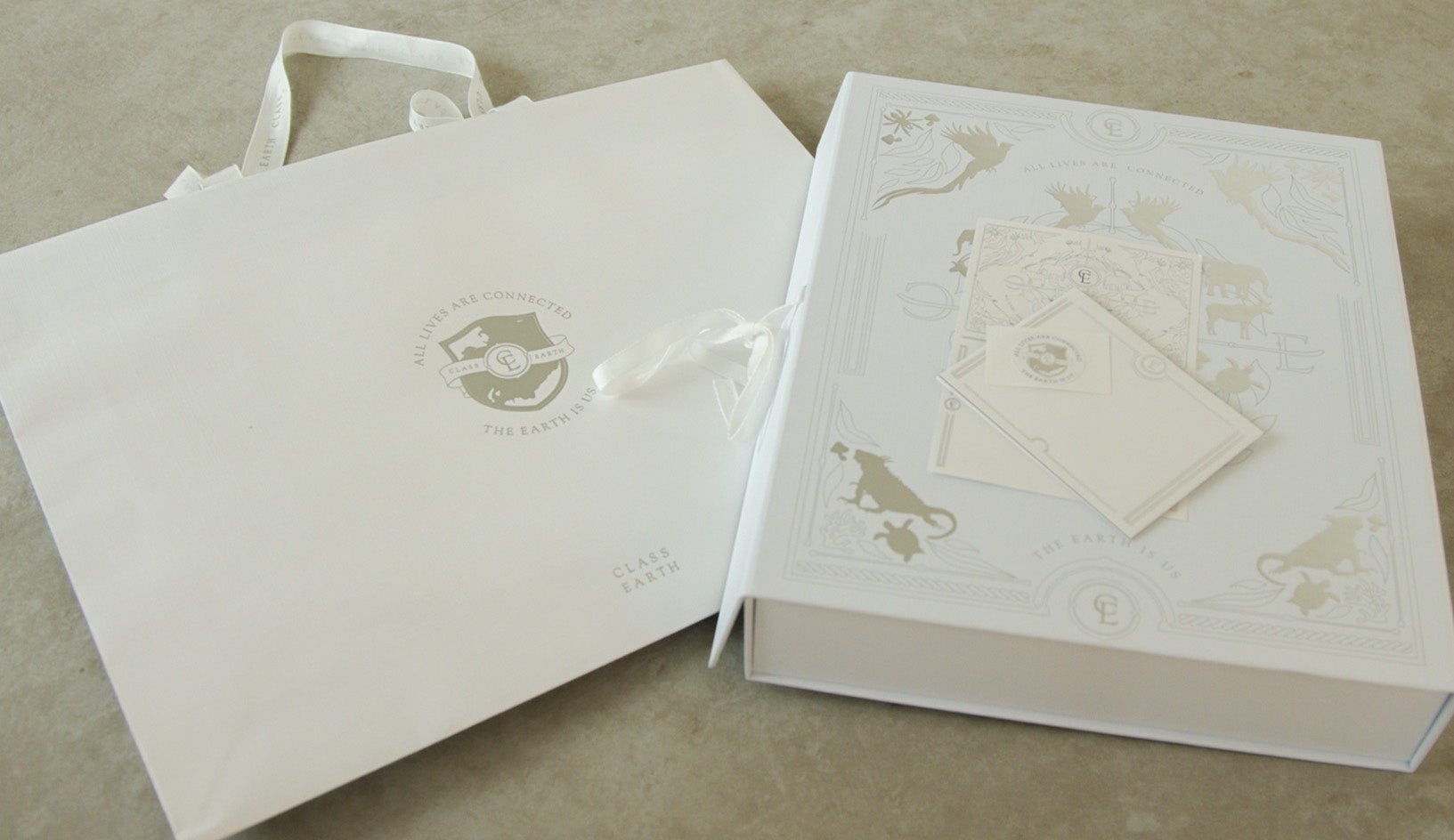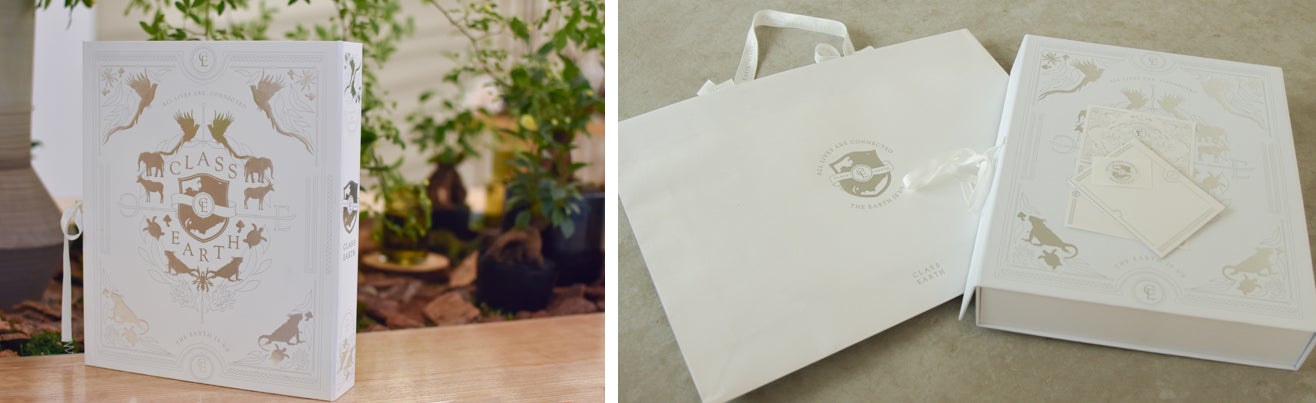 CLASS EARTHはサステイナブルな取り組みを伝え、広げたいという想いから、ギフトに最適なパッケージをご用意しました。アイテムは全て絶滅危惧種エンブレムのパターンの薄紙で包まれ、書籍型のボックスに収められています。購入後も長くご愛用していただくため、ボックスは1点1点手作業で制作された化粧箱を採用しています。ショッパーやメッセージカードも同梱されていますので、すぐにギフトセッティングが可能です。ボックスやショッパーのリボンも木材パルプから作られたテンセルを使用しています。ショッパーやメッセージカードだけでなく薄紙や、ボックスの芯となる厚紙までFSC認証紙で作ったパッケージは世界でも類をみない試みです。通常、売上の2%を自然保護団体に寄付していますが、ギフト包装を辞退すると、追加で2,000円を寄付させていただきます。