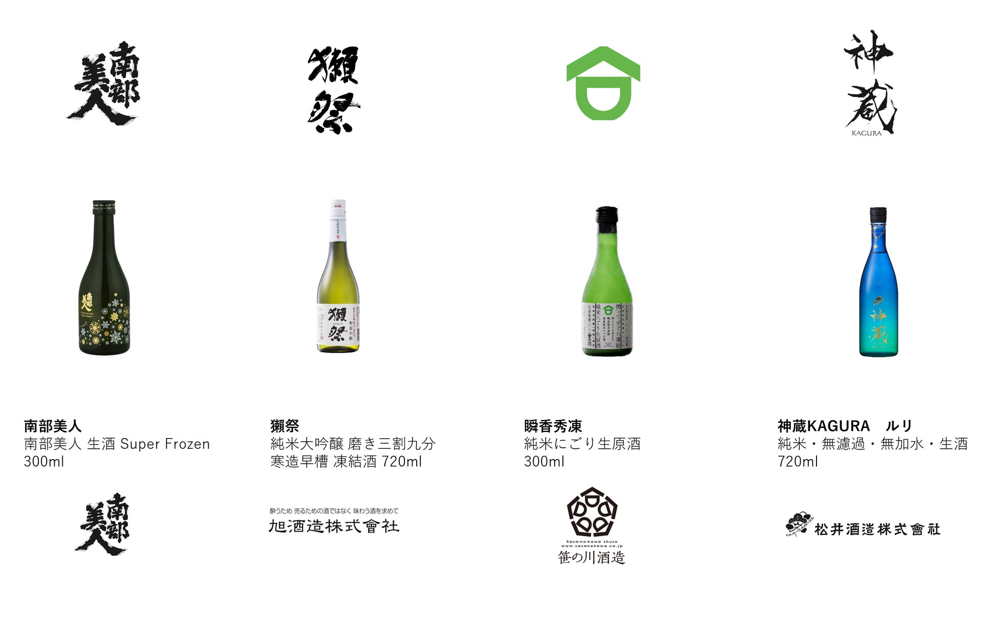 南部美人(南部美人)、獺祭(旭酒造)、瞬香秀凍(笹の川酒造)、神蔵(松井酒造)
