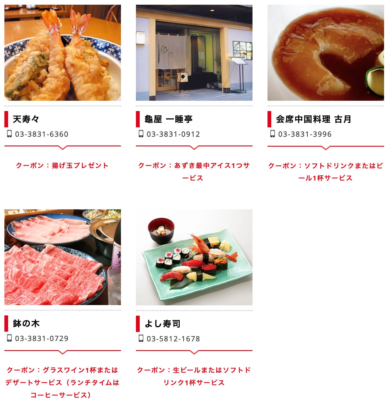 よし寿司 上野店、あんみつ みはし、伊豆榮(鰻割烹)、Hatoya(婦人服)、天寿ゞ (天ぷら)、会席中華料理 上野 池之端 古月、洋食 黒船亭、亀屋 一睡亭(御蒲焼・旬菜料理)、焼肉 太昌園、厳選洋食さくらい、しゃぶしゃぶ 鉢の木