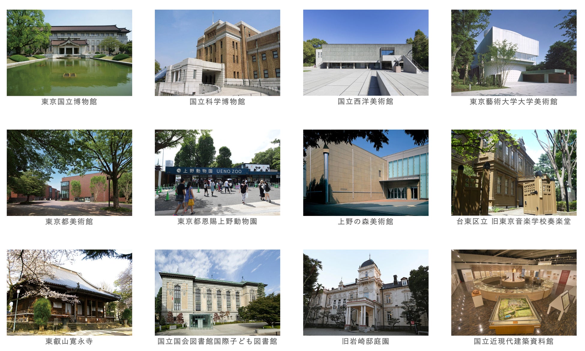 会場(参加施設・団体):東京国立博物館/国立科学博物館/国立西洋美術館/東京藝術大学大学美術館/東京都美術館/東京都恩賜上野動物園/上野の森美術館/台東区立旧東京音楽学校奏楽堂/旧岩崎庭園/国立近現代建築資料館/国立国会図書館国際子ども図書館/東叡山寛永寺/上野のれん会参加店舗(順不同)