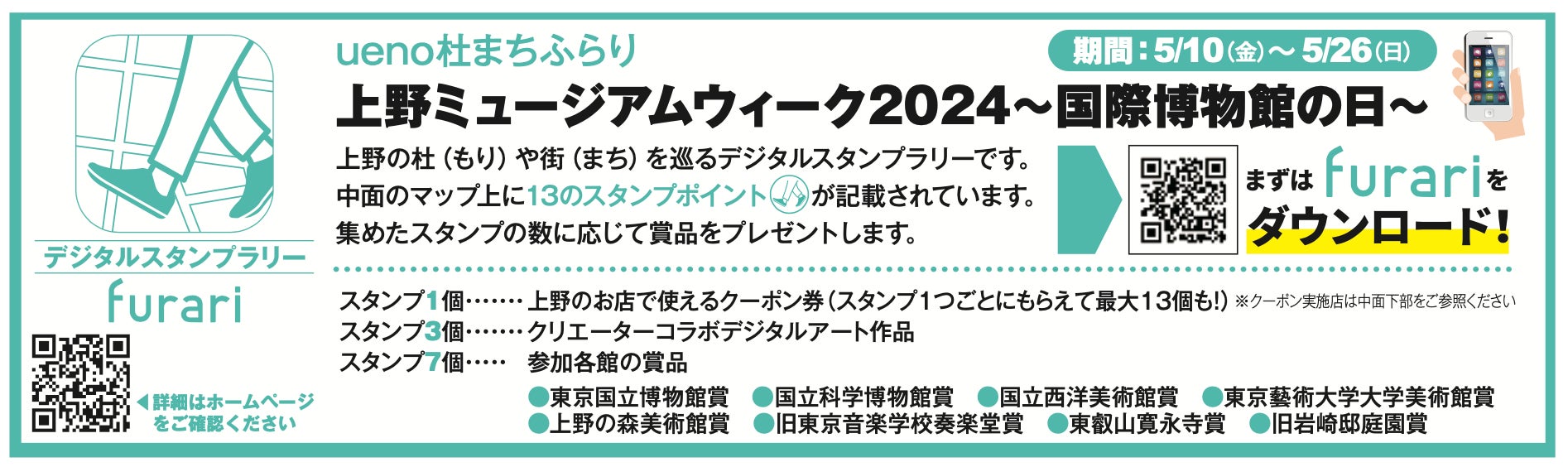 上野エリアでは、5月18日の “国際博物館の日” にちなみ、上野恩賜公園周辺にある博物館や美術館、動物園など 12 施設と、上野のれん会の加盟店が協力し、「上野ミュージアムウィーク」が行われます。今年は初の試みとなるデジタルスタンプラリーも行われます。5月18日の “国際博物館の日” は複数の館が “無料観覧日” となります。毎年恒例の “まちのお楽しみ” クーポンと合わせてフルにお楽しみください。